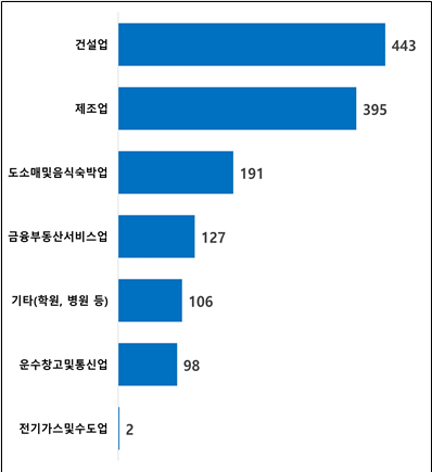 업종별로 살펴보면 최근 5년간 ‘건설업’에서 2회 이상 유죄가 확정된 체불사업주는 443명으로, 전체 산업에서 3분의 1(32.5%)을 차지했다. 최대 14회의 유죄 확정을 받은 건설업자도 있었다. 그 뒤를 이어 ‘제조업’에서 395명(29.0%), ‘도소매 및 음식·숙박업’에서 191명(14.0%), ‘금융·보험·부동산 및 사업서비스업’에서 127명(9.3%), ‘기타업’(학원, 병원 등)에서 106명(7.8%), ‘운수·창고 및 통신업’에서 98명(7.2%), 그리고 ‘전기·가스 및 수도업’에서 2명(0.1%)이 유죄 확정을 받았다. 이들이 받은 유죄 확정 건수는 총 4,053회에 달한다. 1인당 평균 3번은 임금체불로 유죄 판결을 받은 것이다.