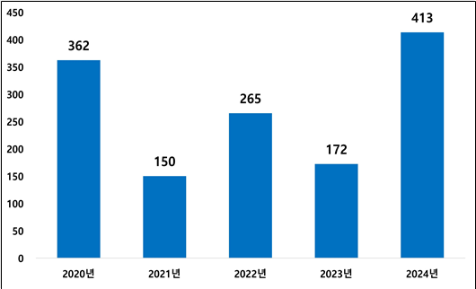 연도별로 살펴보면 2회 이상 유죄 확정을 받은 체불사업주가 2020년 362명, 2021년 150명, 2022년 265명, 2023년 172명으로 증감을 반복하다 2024년에 갑자기 413명으로 급증했다. 전년도에 비해 무려 140%나 증가한 셈이다.