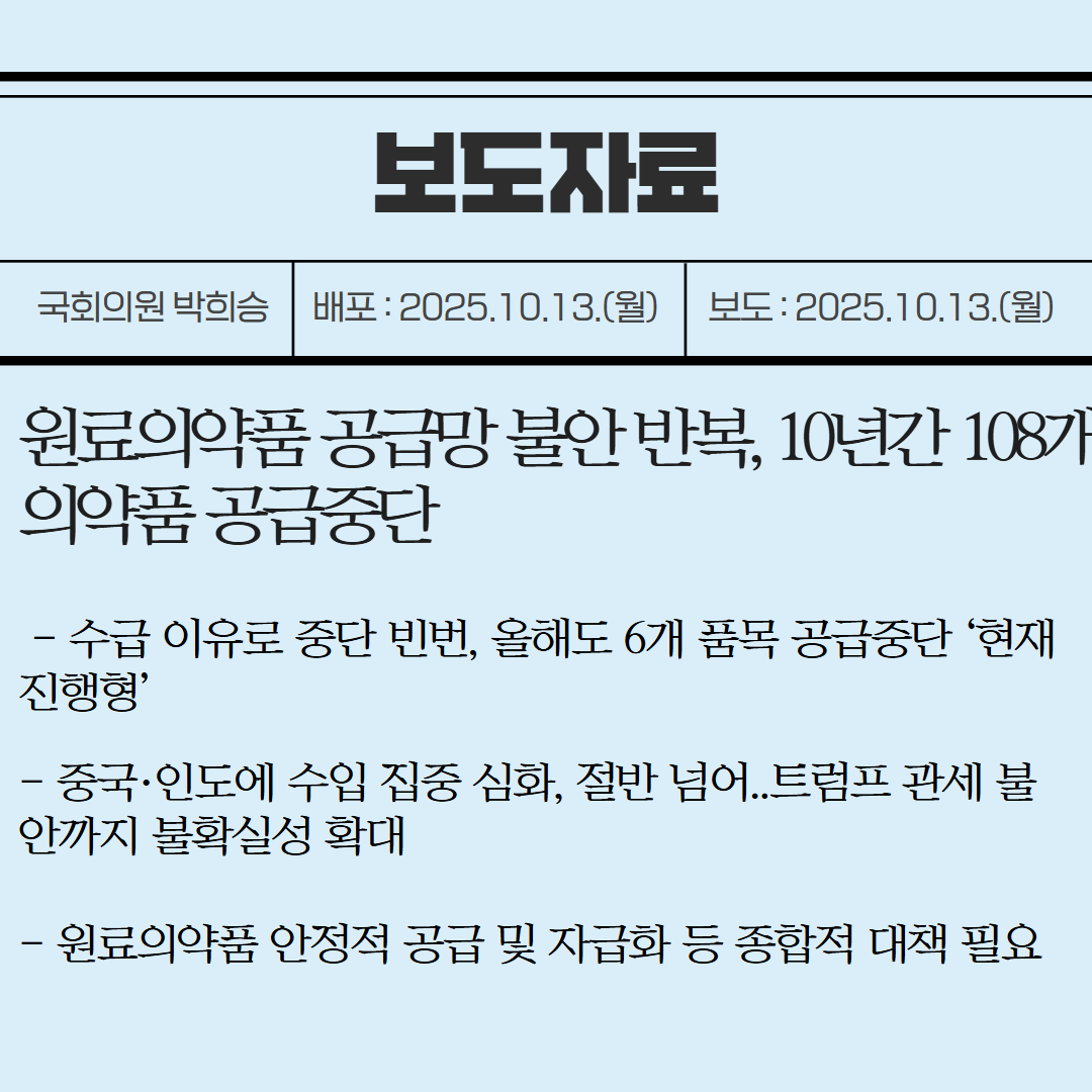 [국회의원 박희승 보도자료] 원료의약품 공급망 불안 반복, 10년간 108개 의약품 공급중단