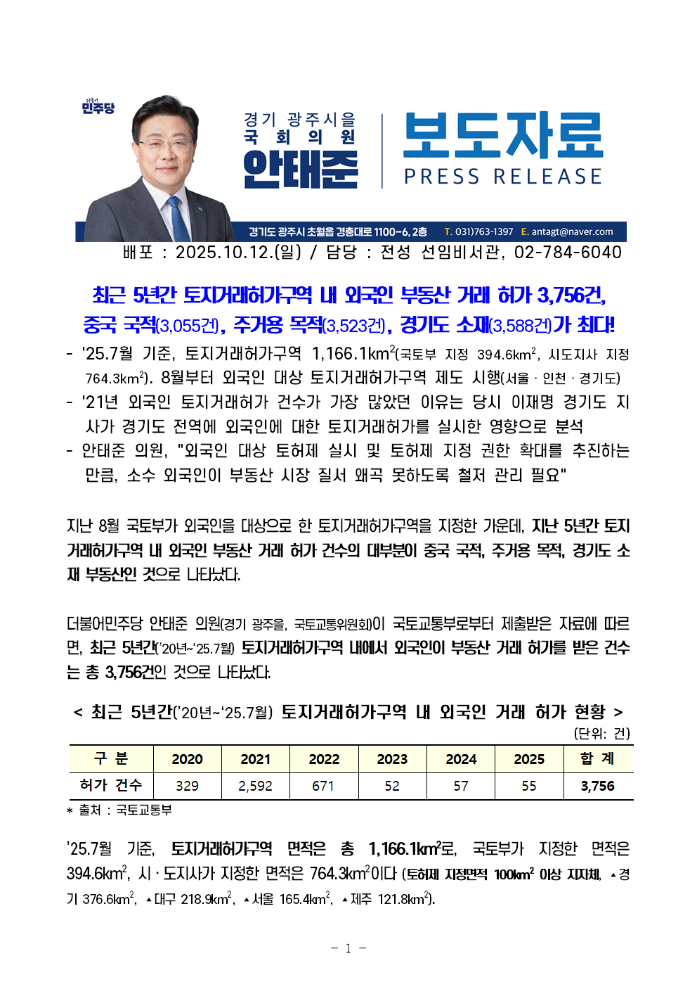 251012 (안태준 의원 보도자료) 1. 토허제 내 외국인 부동산 거래 허가 5년간 3756건 중국 국적 주거용 목적 경기도 소재가 최다!.hwp