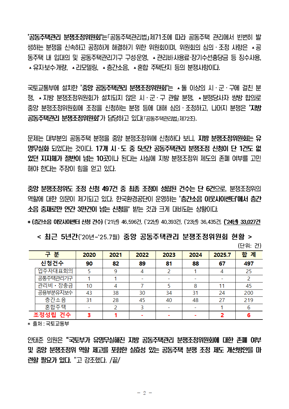 [안태준 의원 보도자료] 유명무실한 지방 공동주택관리 분쟁조정위, 5년간 분쟁조정 신청 단 42건!, 0건인 지자체도 10곳!