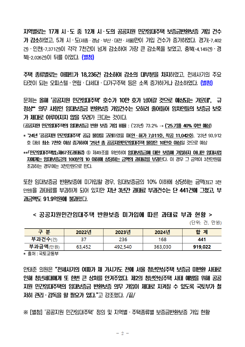 251012 (안태준 의원 보도자료) 7. ’민간임대주택‘ 보증금반환보증 의무 가입에도 가입 건수 1.3만건 이상 감소!.hwp