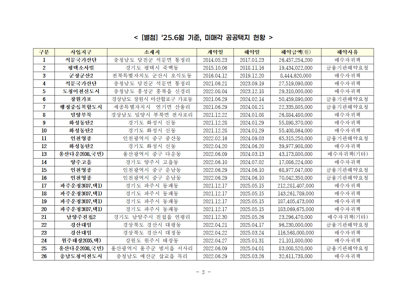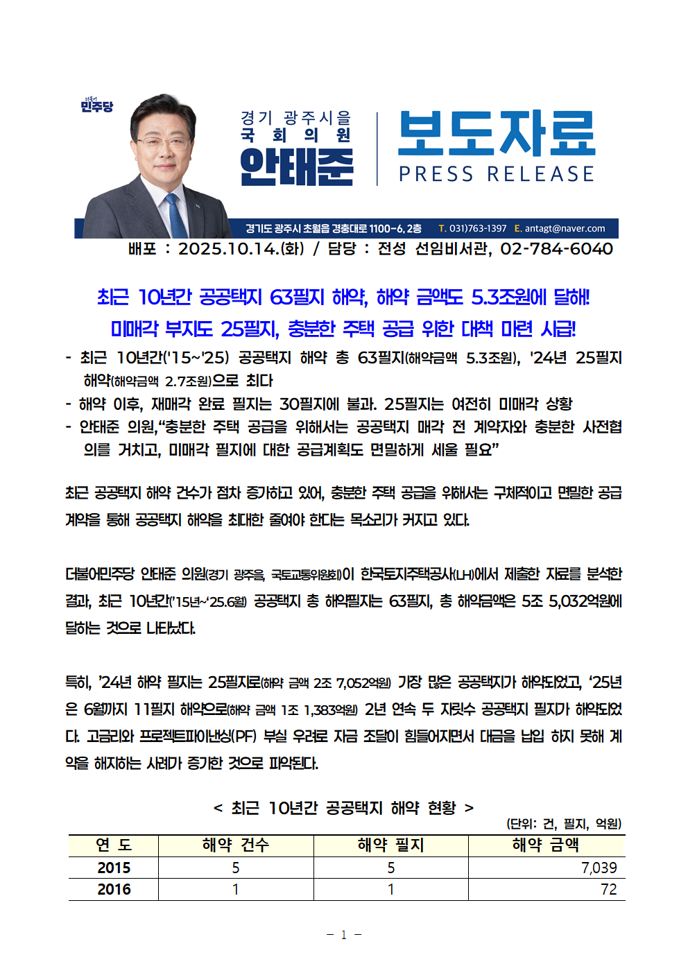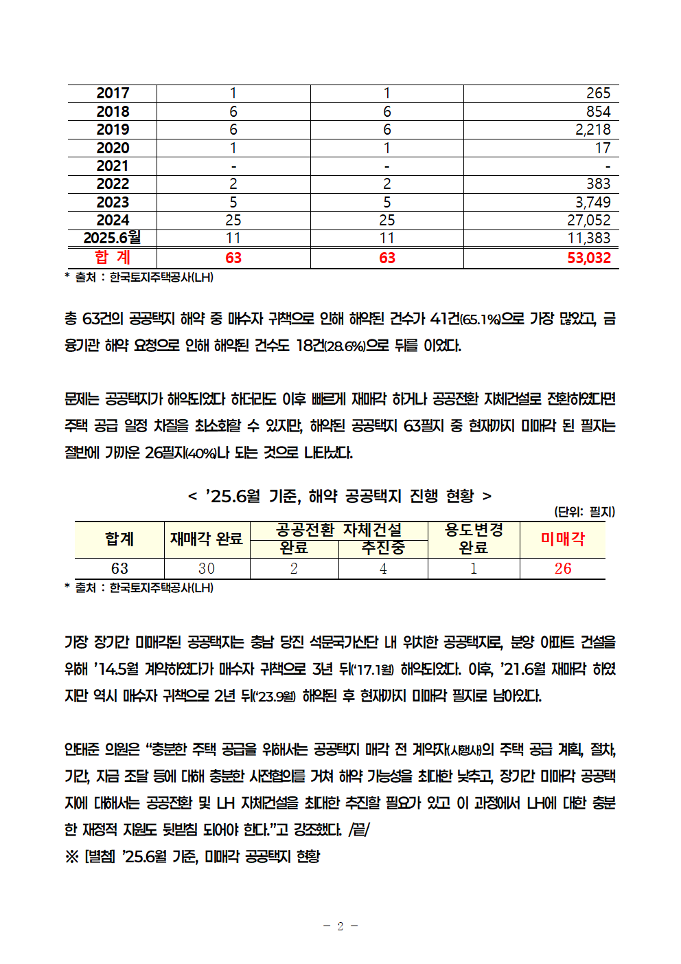 [안태준 의원 보도자료] 10년간 공공택지 63필지 해약, 해약 금액도 5.3조원에 달해!