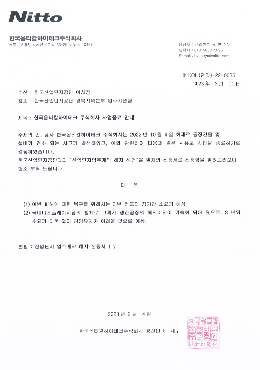 그런데 2022년 원인 불명의 화재로 공장이 전소하자 구미 한국옵티칼은 일방적으로 폐업을 통보하며 노동자들을 희망퇴직으로 내보냈고, 이를 거부한 노동자들은 정리해고했다. 회사는 1)피해복구에 3년 정도의 장시간이 소요되는 점과 2)국내 디스플레이시장의 침체로 수요가 없어 경영유지가 어려운 점을 내세우며 폐업했다.