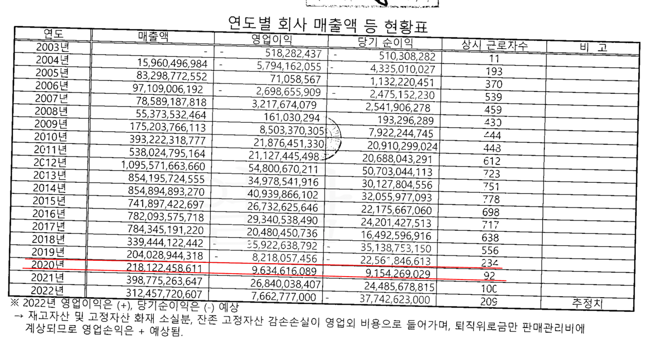 오늘(14일) 국회 환경노동위원회 간사 김주영 의원(더불어민주당, 김포시갑)이 입수한 <한국옵티칼하이테크 연도별 회사 매출액 등 현황표>를 분석한 결과, 회사는 2003년 공장 설립 이래 2012년 약 507억 원의 최대 흑자를 기록했다.