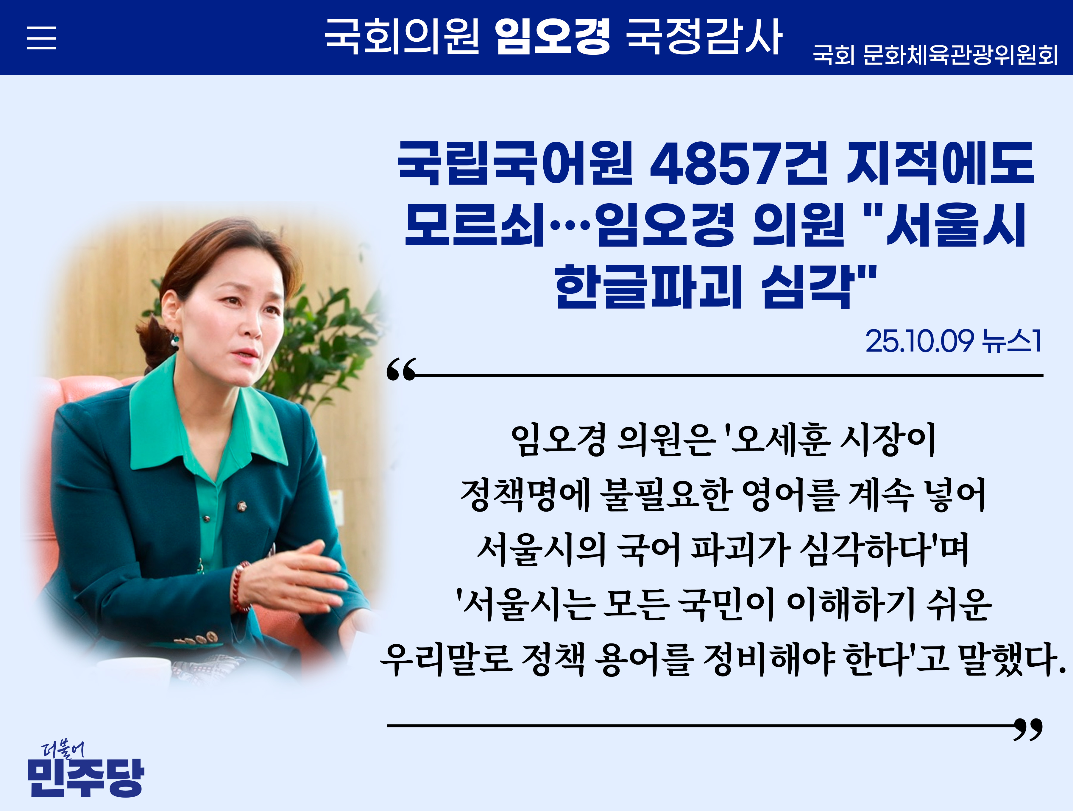 [임오경 카드뉴스]뉴스1 / 국립국어원 4857건 지적에도 모르쇠…임오경 의원 "서울시 한글파괴 심각"