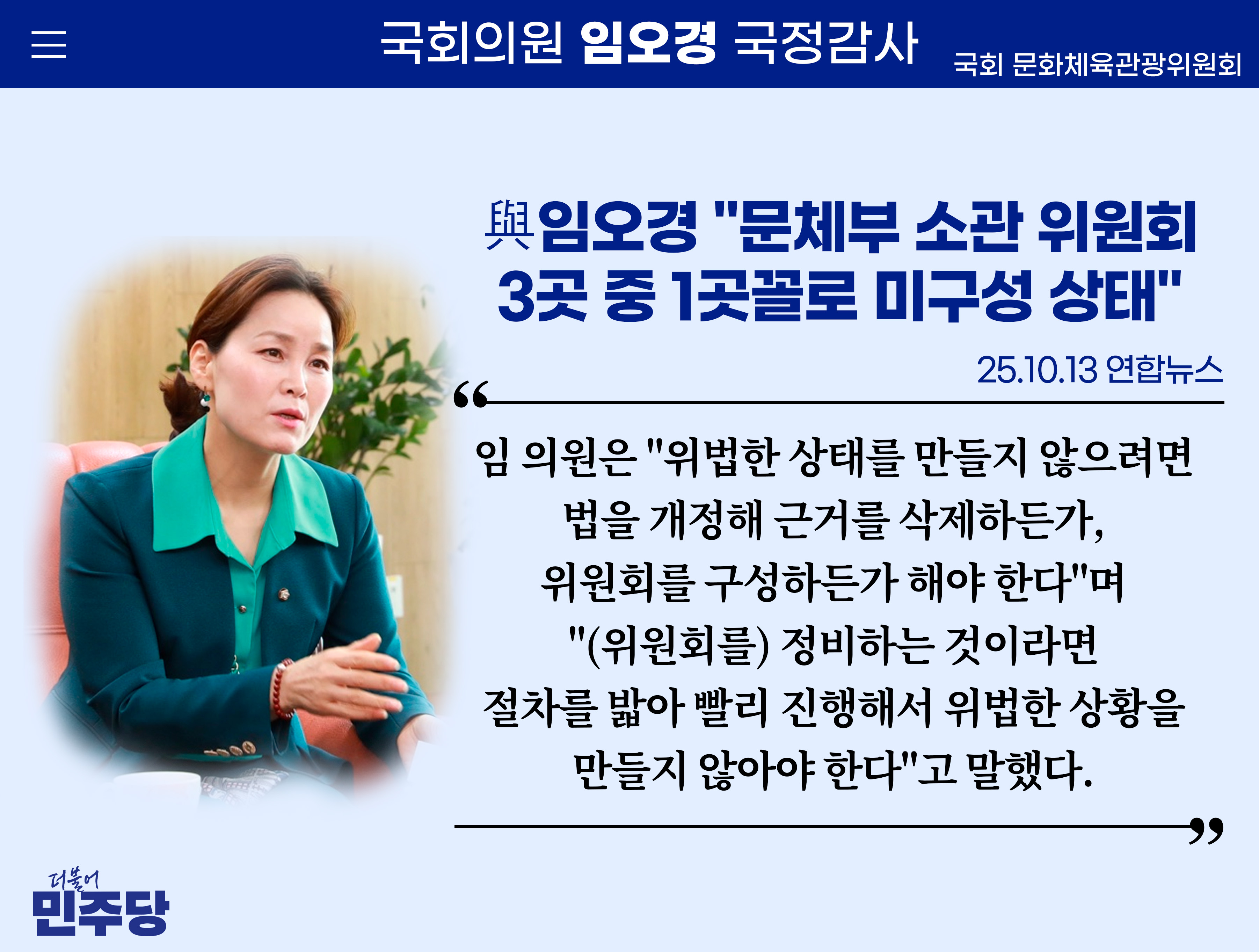 [임오경 카드뉴스]연합뉴스 / 與임오경 "문체부 소관 위원회 3곳 중 1곳꼴로 미구성 상태"