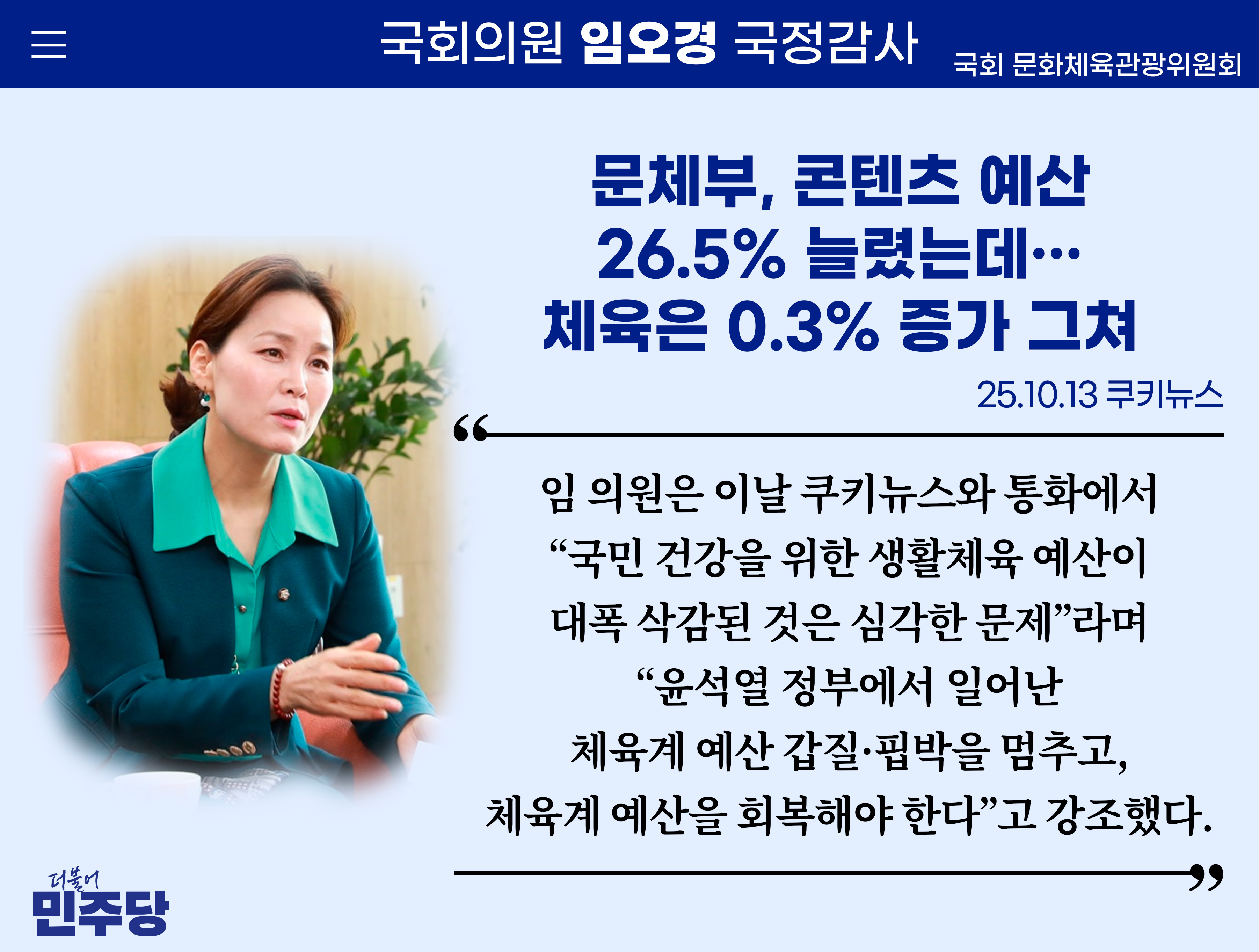 [임오경 카드뉴스]쿠키뉴스 / [단독] 문체부, 콘텐츠 26.5% 예산 증액했지만…체육계는 0.3%↑왜?