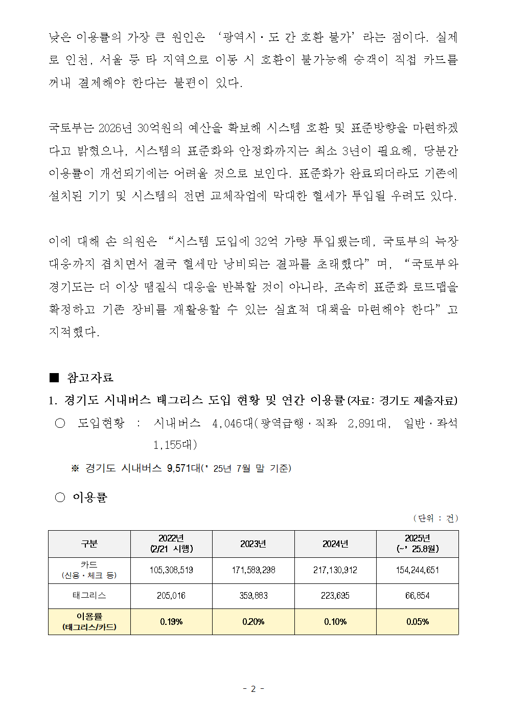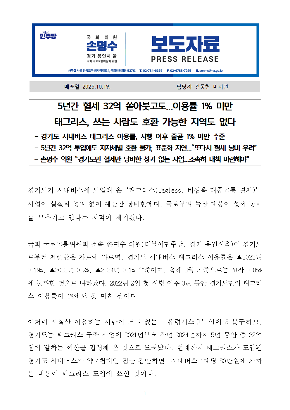 [국회의원 손명수 보도자료] 5년간 혈세 32억 쏟아붓고도...이용률 1% 미만 태그리스, 쓰는 사람도 호환 가능한 지역도 없다
