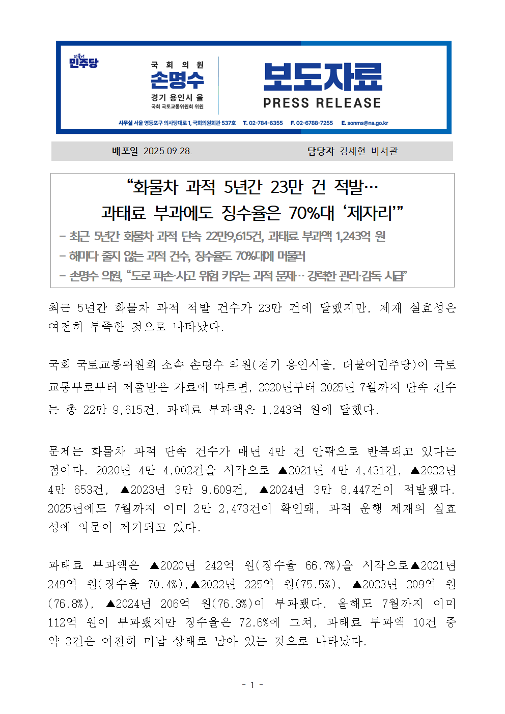 [국회의원 손명수 보도자료] “화물차 과적 5년간 23만 건 적발… 과태료 부과에도 징수율은 70%대 ‘제자리’”