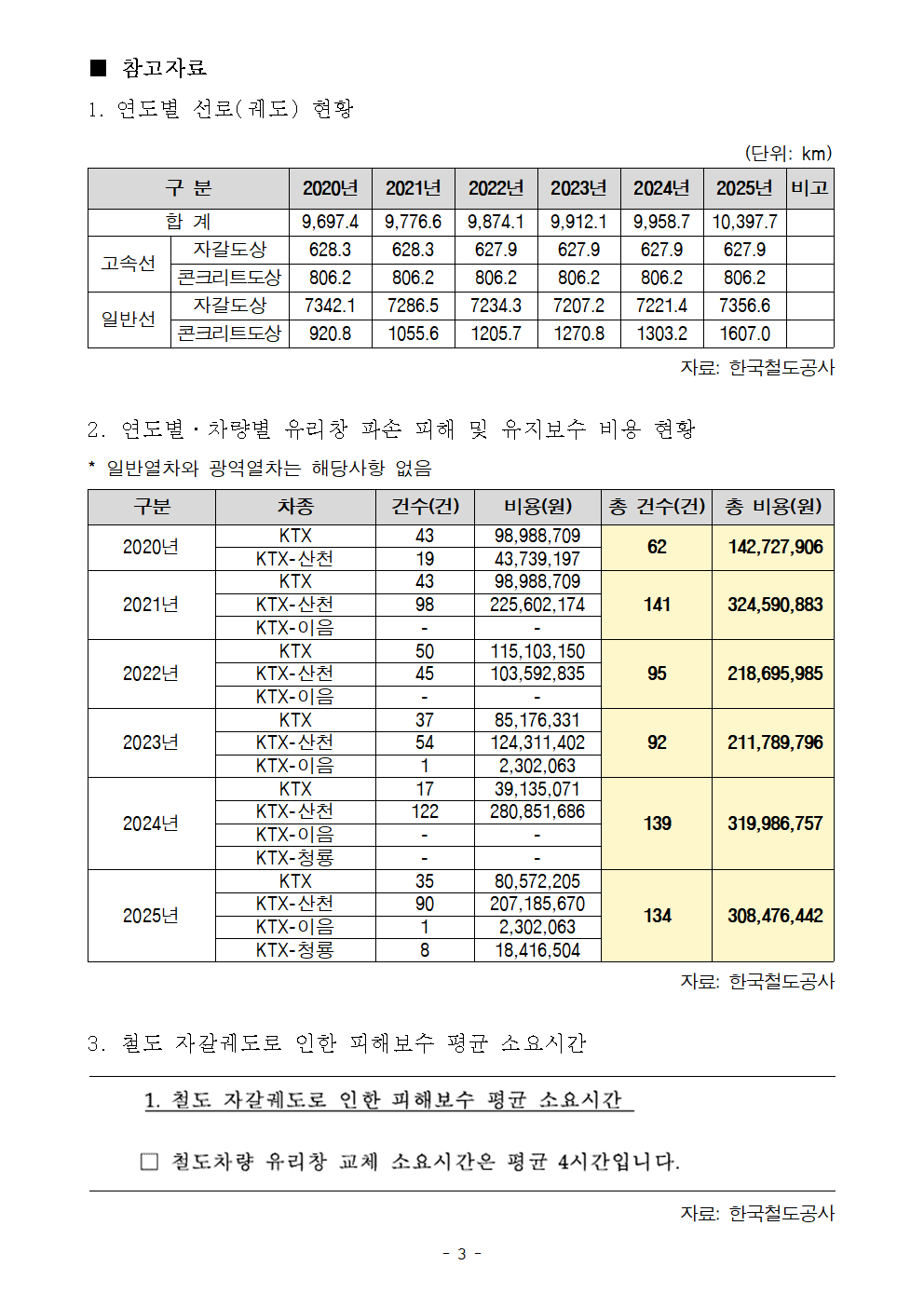 [국회의원 손명수 보도자료] 철도 자갈 바닥, 승객 안전을 위협한다... 5년간 자갈로 인한 고속열차 유리창 파손 663건