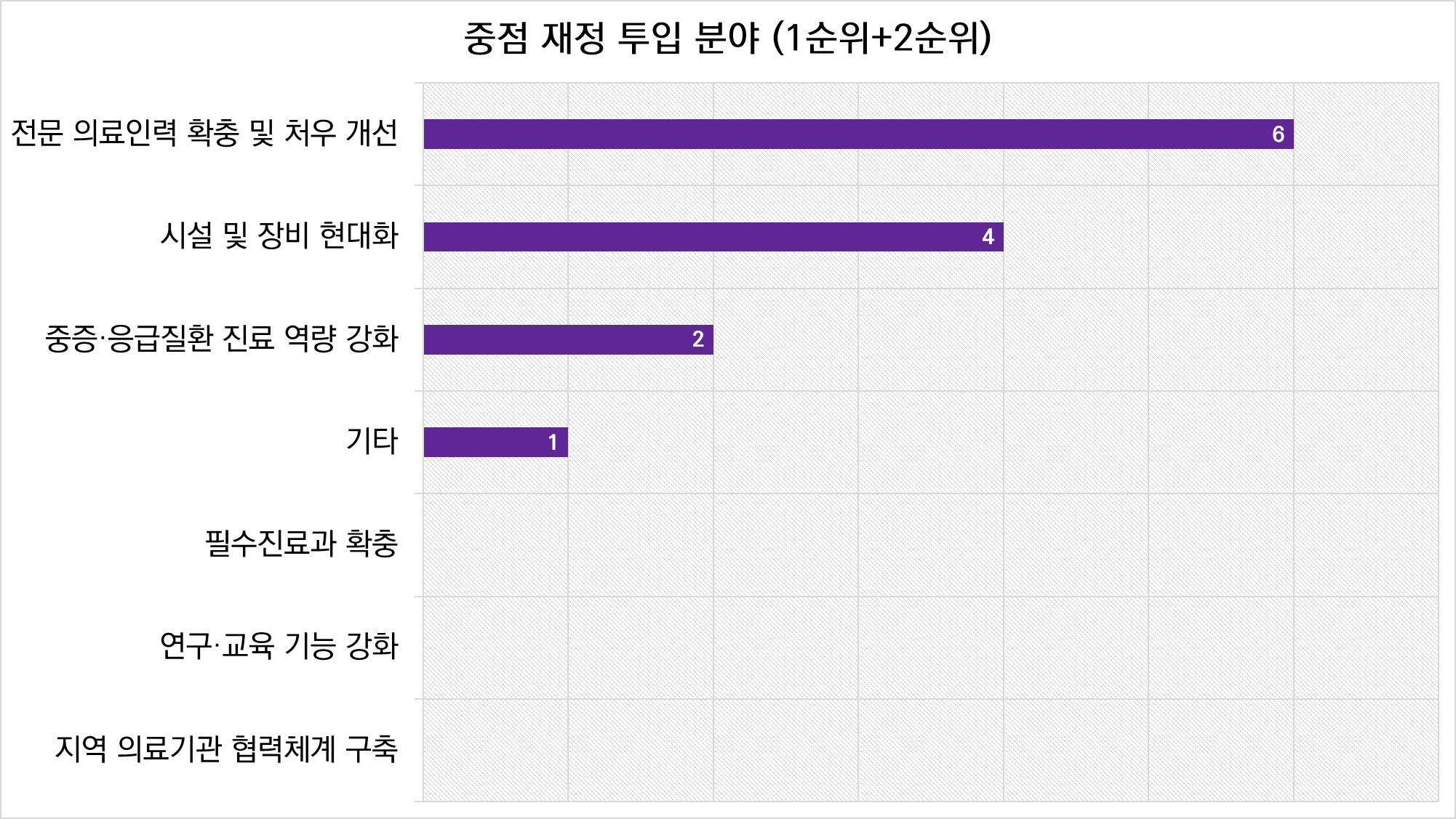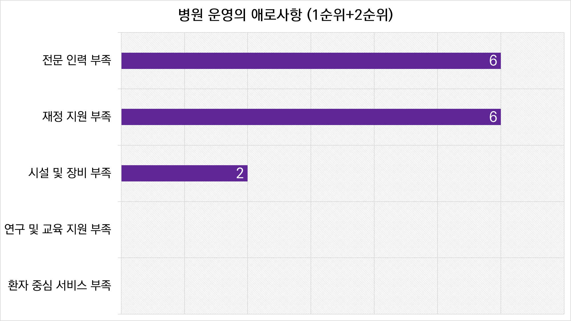 병원 운영의 가장 큰 애로사항으로는 전문 인력 부족과 재정 지원 부족이 꼽혔다. 복수응답 결과, 조사에 참여한 7개 병원 중 6곳이 두 요인이 ‘부족하다’고 답했다. 시설·장비 부족은 2순위 항목에서 2곳이 지목했다. 인력난과 재정난이 지역국립대학병원의 구조적 문제로 자리 잡고 있음을 보여준다.