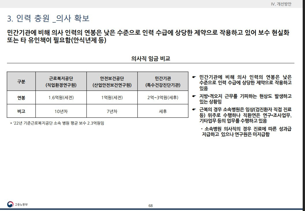 한편, 의사 확보 어려움의 원인으로 낮은 급여, 지방근무 등의 문제가 지적됐다. 지난 2023년 고용노동부가 학술연구용억사업의 일환으로 실시한 <역학(전문)조사 처리절차·업무량 분석 등을 통한 개선방안 연구>에서 역시 “민간기관에 비해 의사 인력의 연봉은 낮은 수준으로 인력 수급에 상당한 제약으로 작용하고 있어 보수 현실화”가 필요하다고 언급한 바 있다.