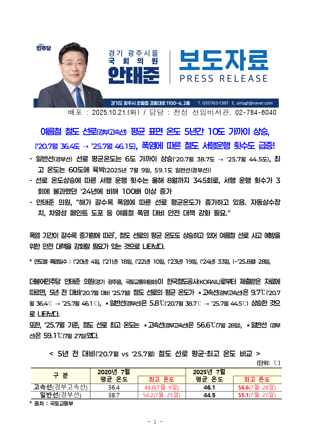 251021_안태준_의원_보도자료_여름철_철로_온도_5년간_10도_가까이_상승_서행운행_횟수도_급증!.hwp