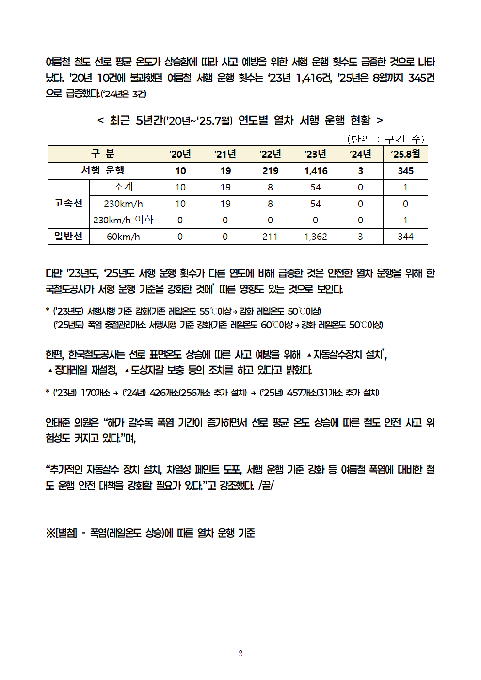 [안태준 의원 보도자료] 여름철 철로 온도 5년간 10도 가까이 상승, 서행운행 횟수도 급증!.hwp
