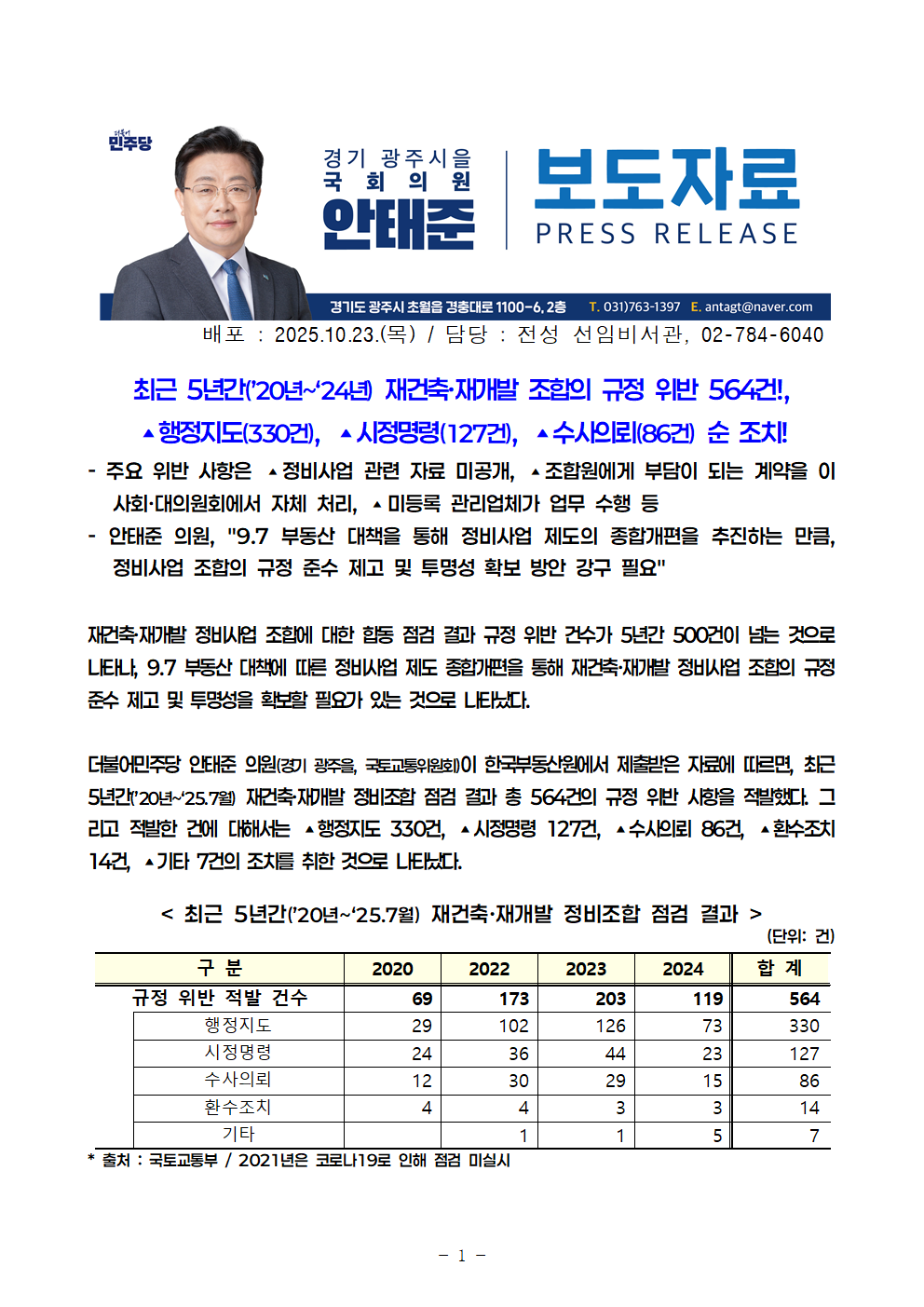 251023_안태준_의원_보도자료_3_5년간_재건축ㆍ재개발_조합의_규정_위반_564건에_달해!.hwp