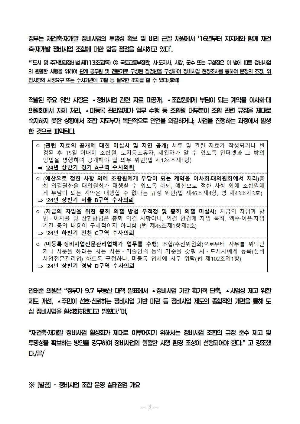 [안태준 의원 보도자료] 5년간 재건축ㆍ재개발 조합의 규정 위반 564건에 달해!
