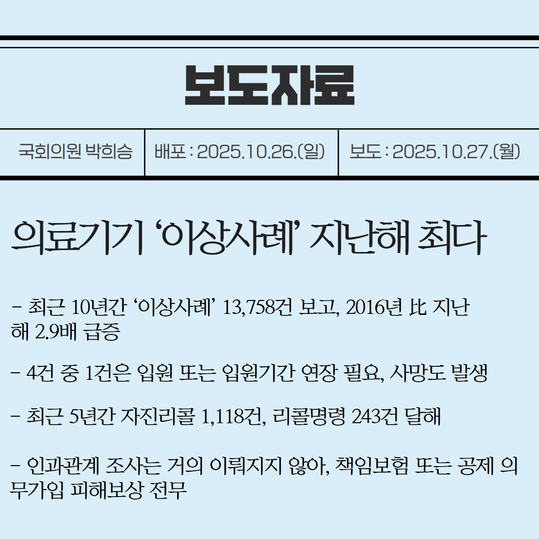 [국회의원 박희승 보도자료] 의료기기 ‘이상사례’ 지난해 최다