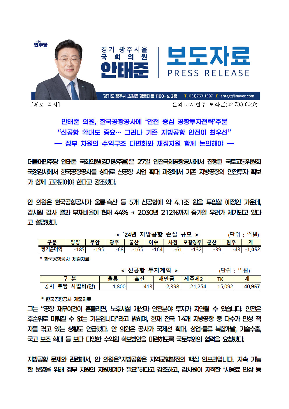 251027_보도자료_안태준_의원실_안태준 의원 한국공항공사에 ‘안전 중심 공항투자전략’ 주문.hwp