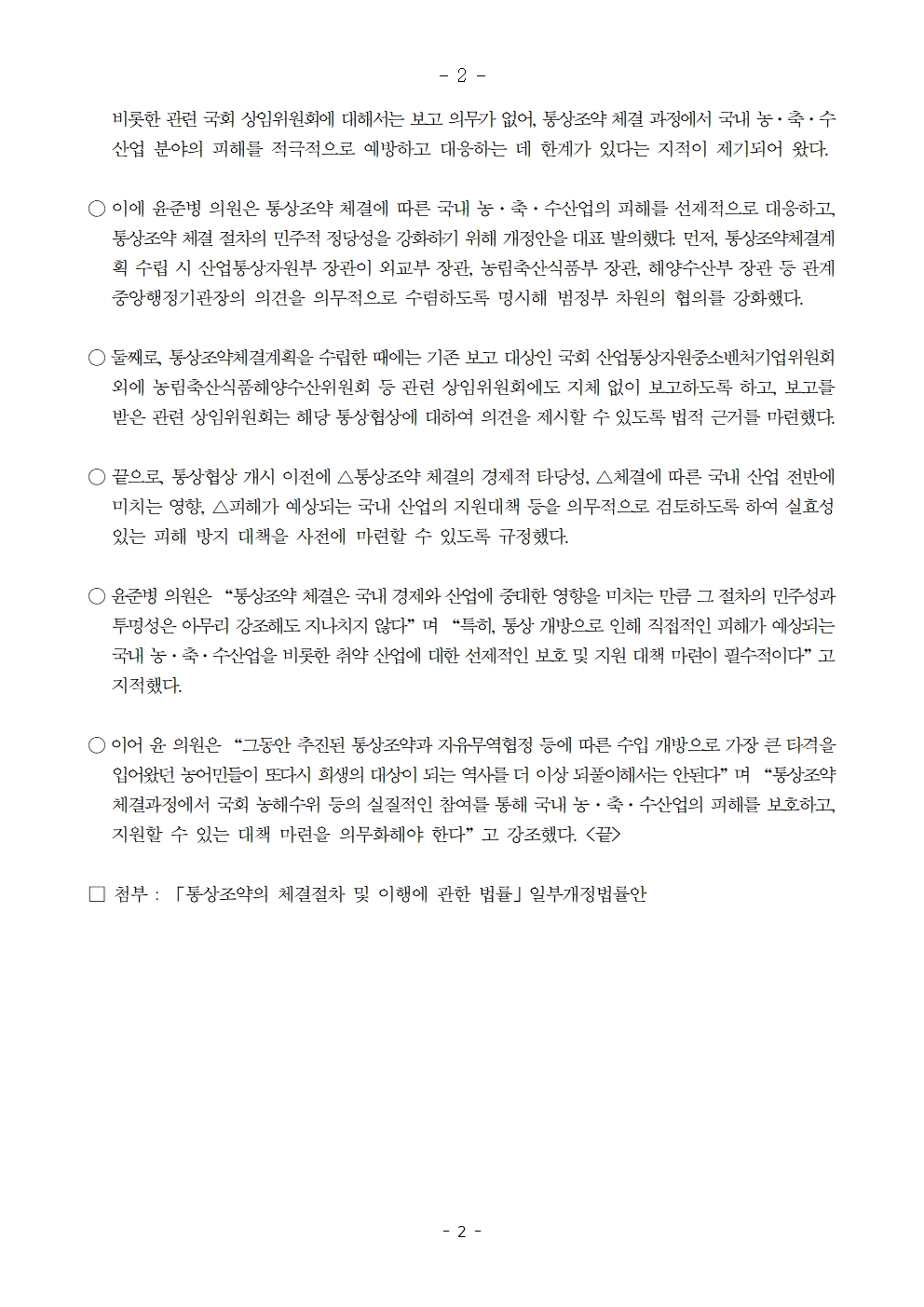 [윤준병 의원 국정감사 보도자료] 윤준병 의원, 국내 농축수산업 분야, 통상조약 체결 따른 수입개방 피해 심각