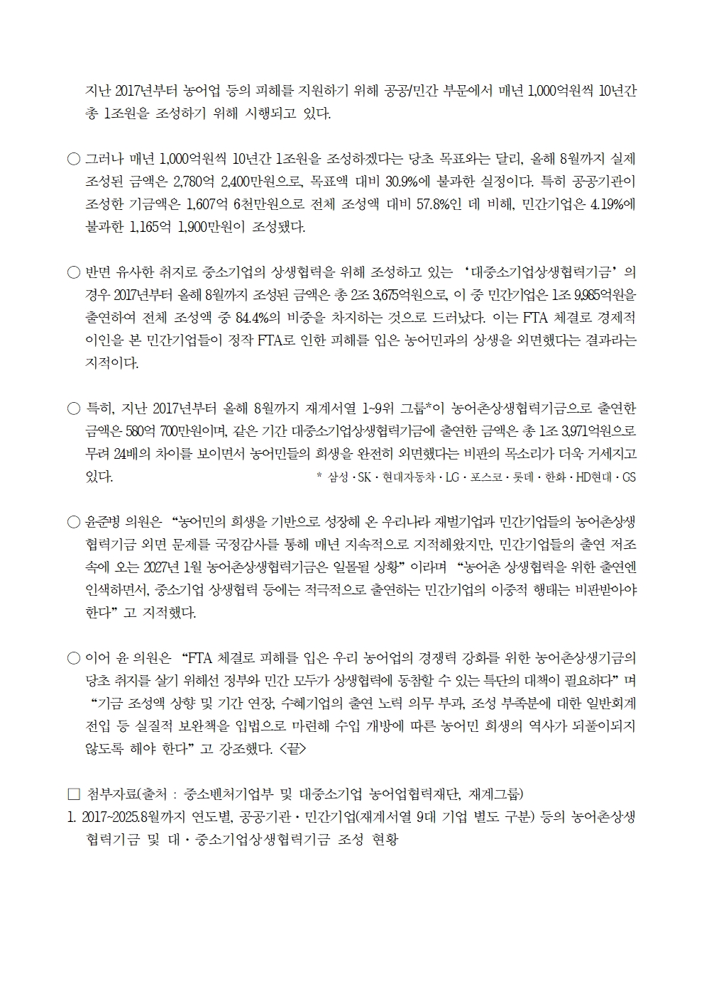 251001 [윤준병 의원 국정감사 보도자료] 민간기업의 농어촌 상생 위한 기금 출연비중 41% 반해 중소기업엔 84%.hwp