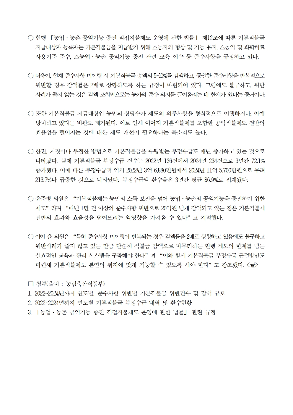 251012 [윤준병 의원 국정감사 보도자료] 기본직불금 수령 위한 준수사항 미이행 매년 1.2만건 연간 20억원 감액.hwp