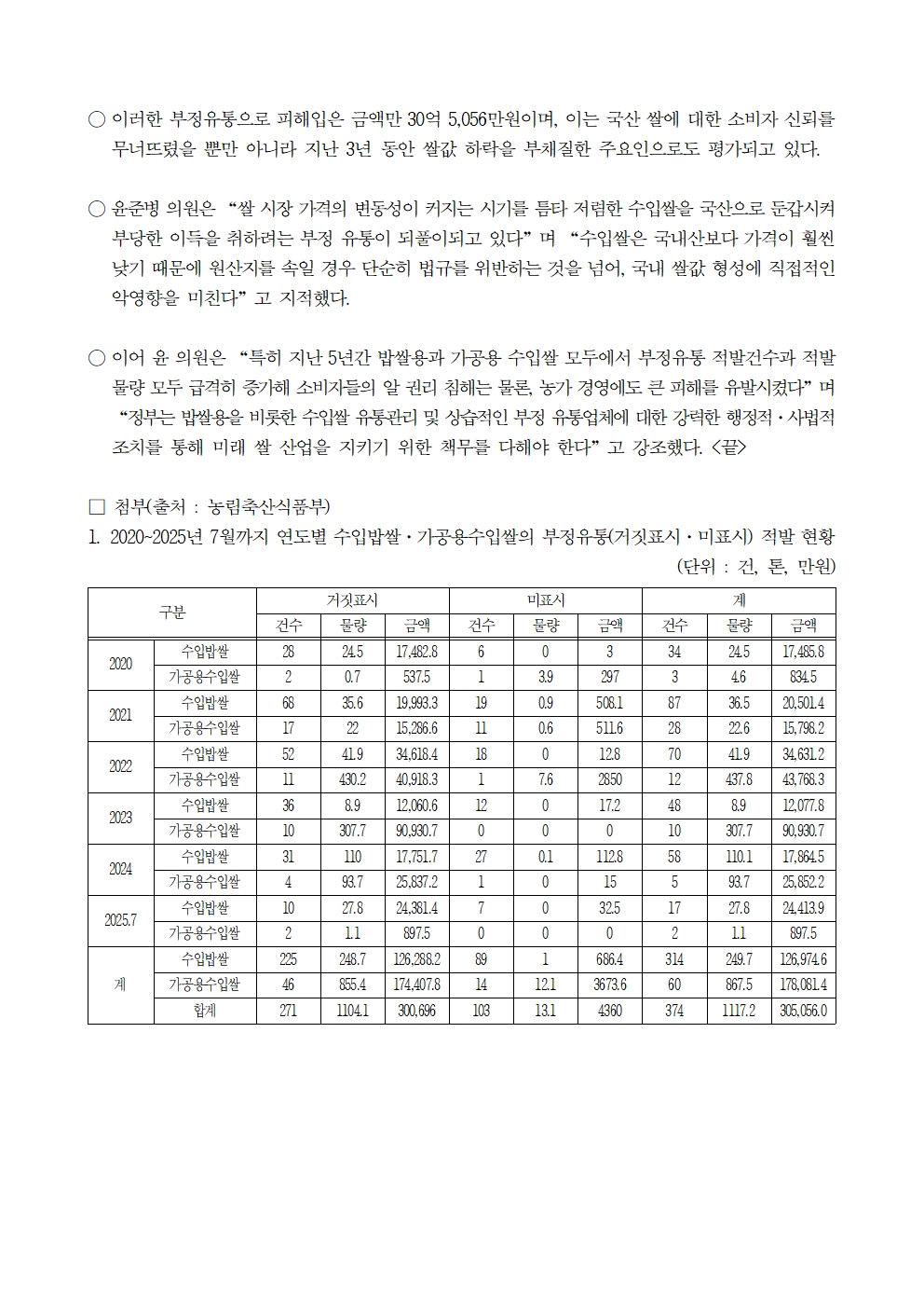 251016 [윤준병 의원 국정감사 보도자료] 최근 5년간 수입쌀 거짓표시 등 부정 유통 물량 600% 폭증!.hwp