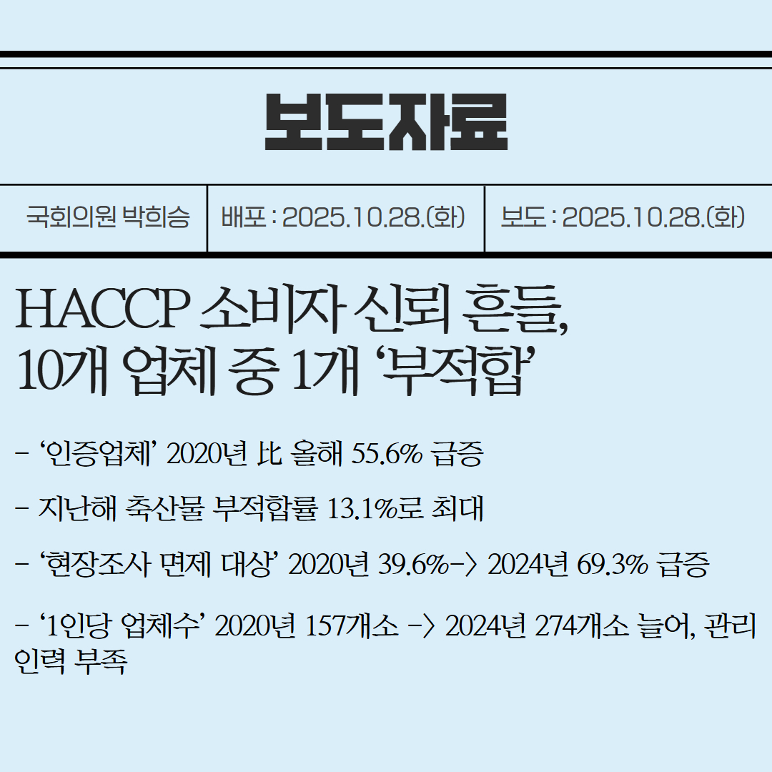[국회의원 박희승 보도자료] HACCP 소비자 신뢰 흔들, 10개 업체 중 1개 ‘부적합’