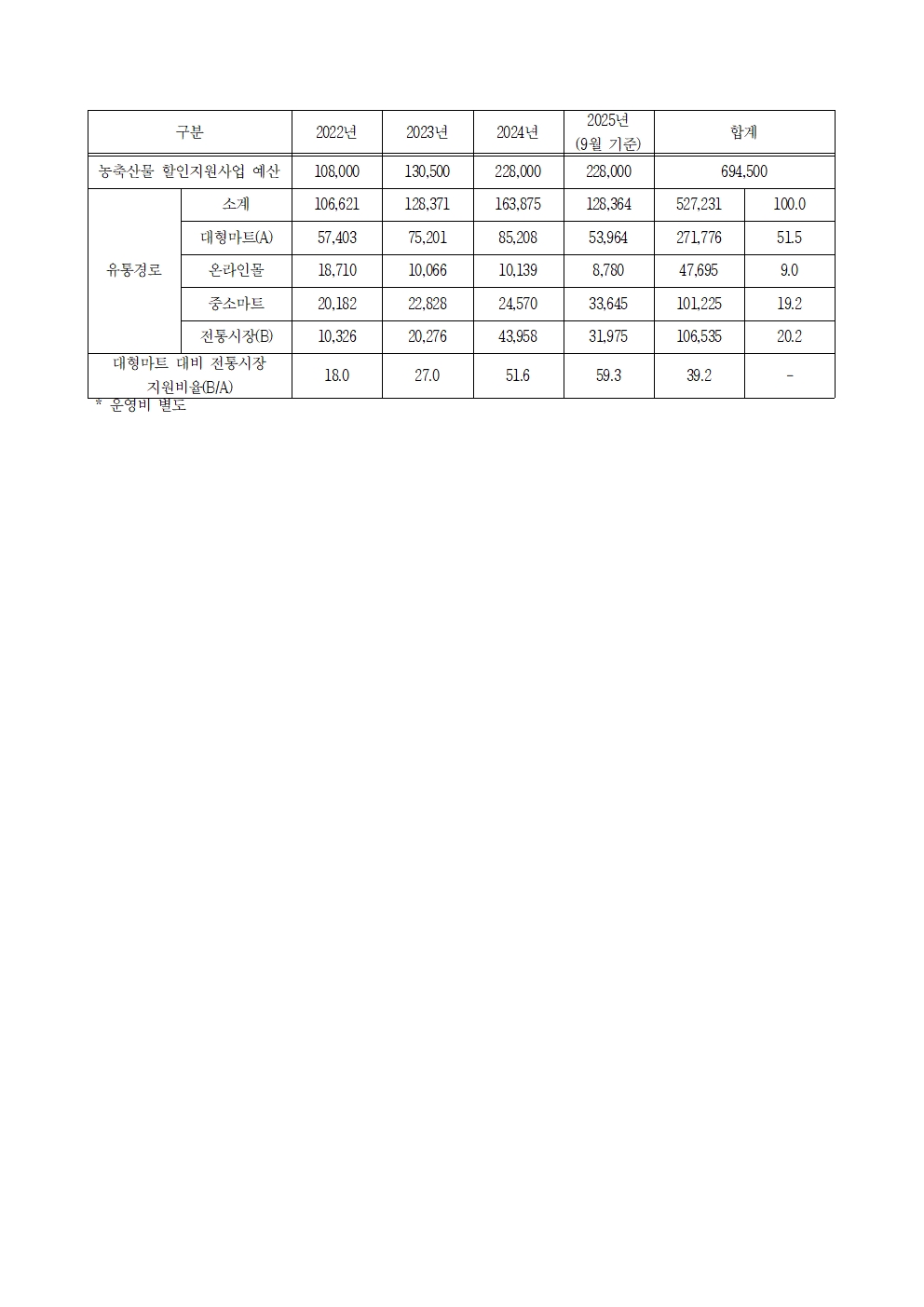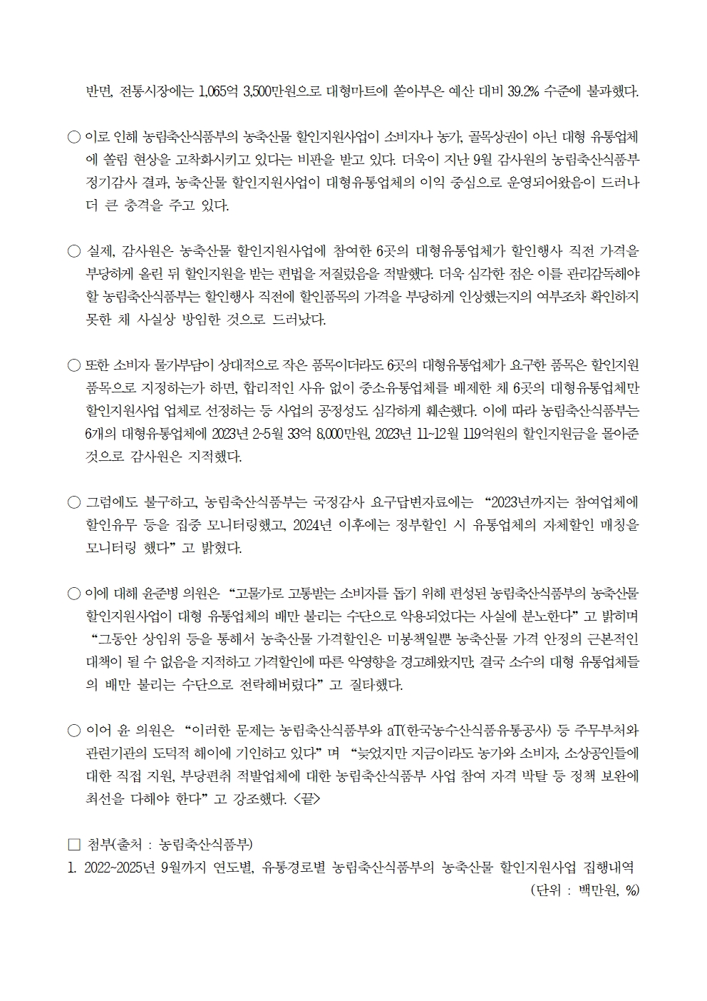 251018 [윤준병 의원 국정감사 보도자료] 윤준병 의원 “대형마트 배만 불리는 농식품부의 농축산물 할인지원사업!”.hwp