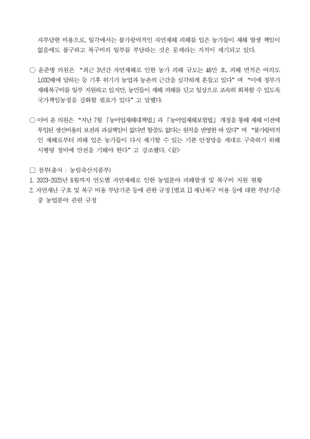 251025 [윤준병 의원 국정감사 보도자료] 3년간 자연재해 피해농가 48만호 피해면적 여의도의 1032배 면적!.hwp