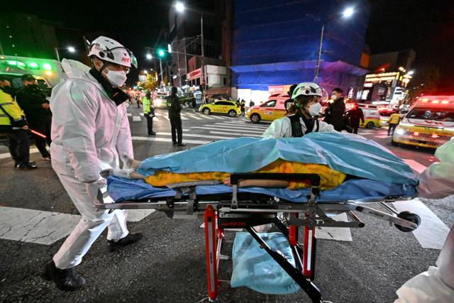2022년 10월 29일 핼러윈데이를 앞두고 서울 용산구 이태원 세계음식거리 인근에서 압사 사고가 일어나자 119구급대원이 구조 활동을 벌이고 있다. 한국일보 자료사진