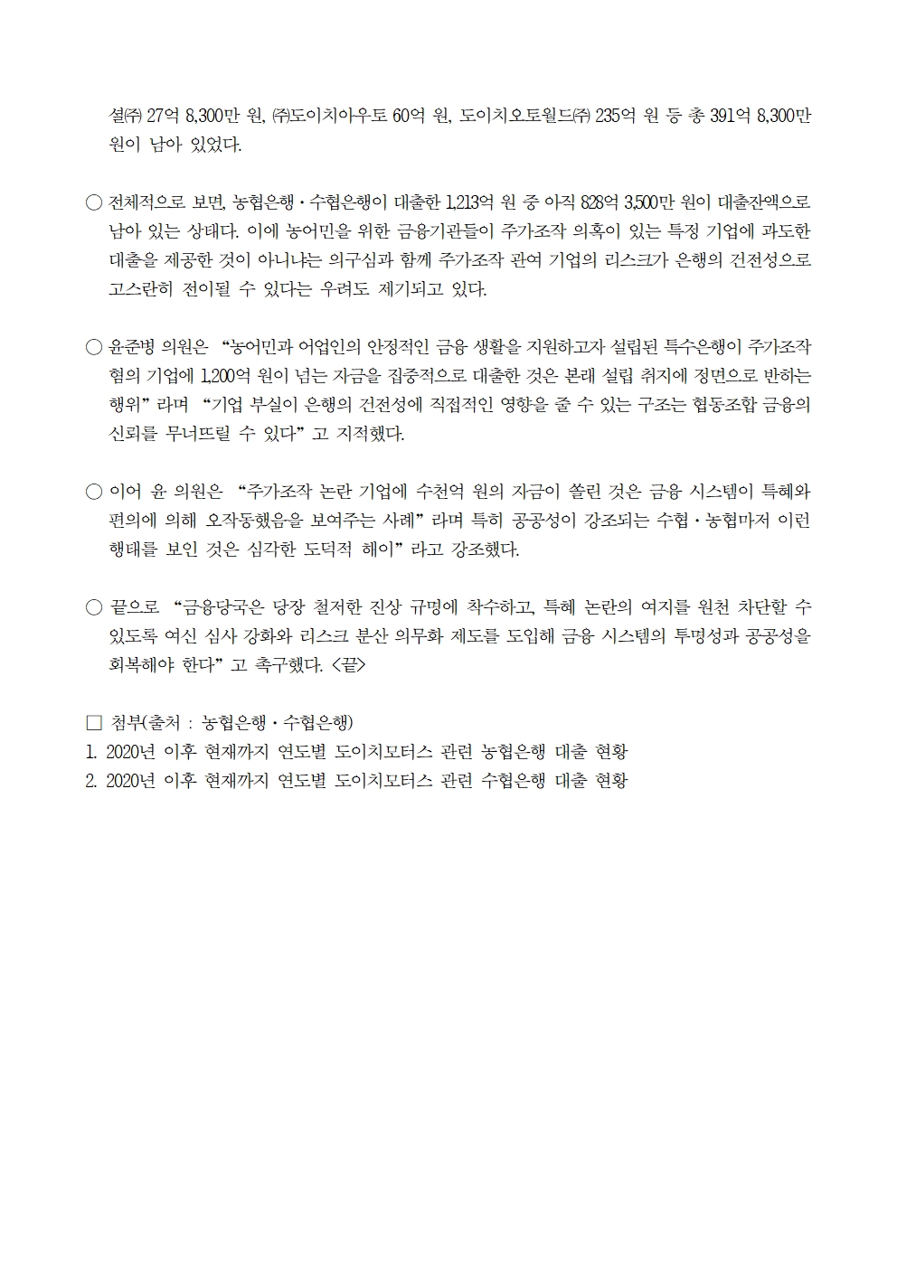 [윤준병 의원 국정감사 보도자료] 농어민을 위한 농협은행·수협은행 도이치모터스에 5년간 1,200억 대출