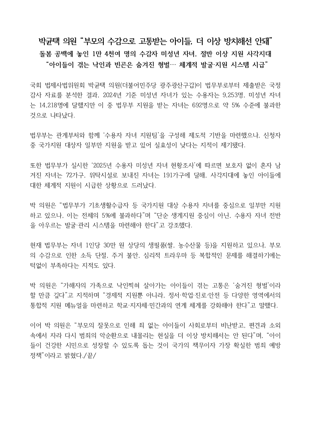 [박균택 의원 국정감사 보도자료] 박균택 의원 “부모의 수감으로 고통받는 아이들, 더 이상 방치해선 안돼”