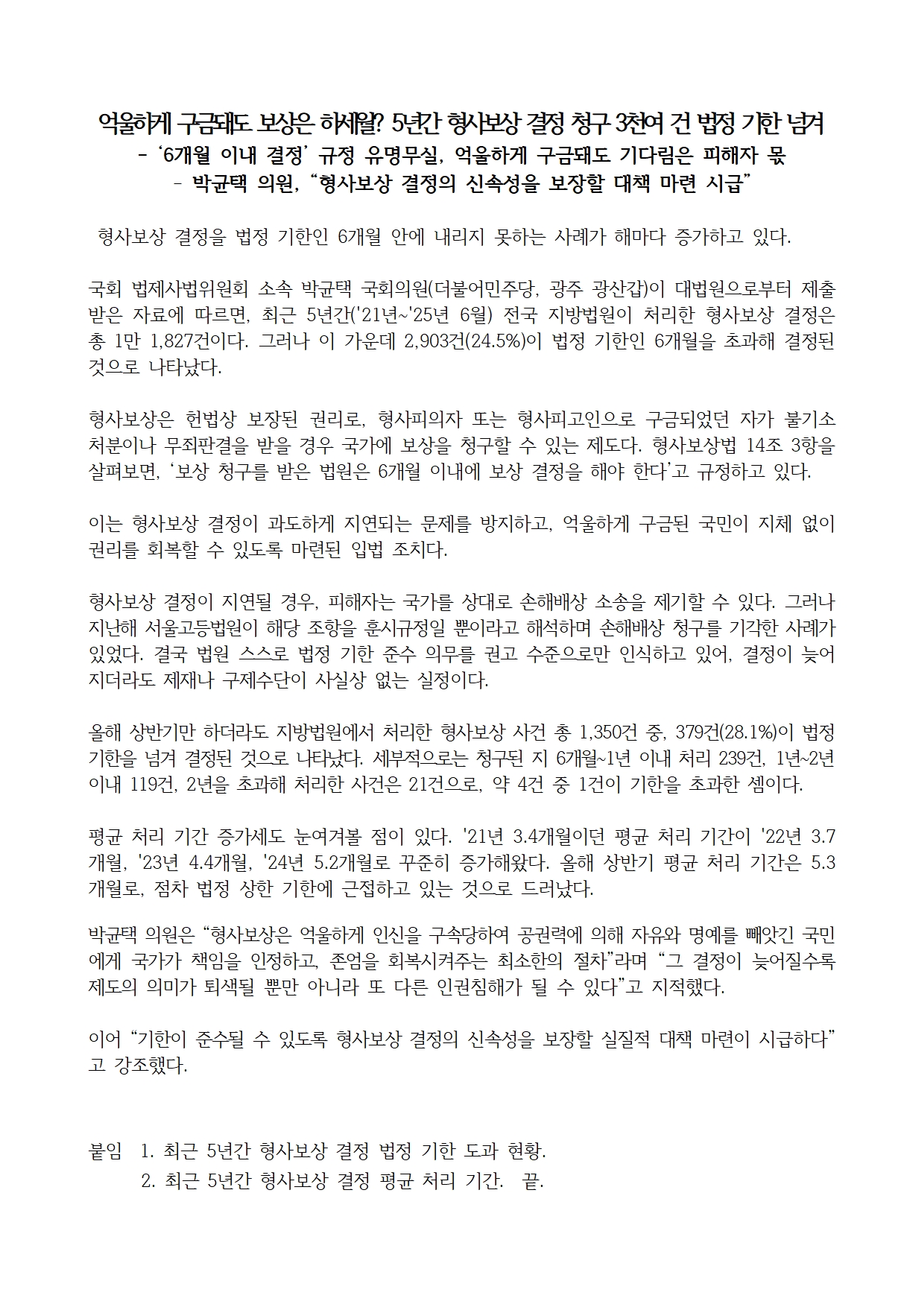 [박균택 의원 국정감사 보도자료] 억울하게 구금돼도 보상은 하세월? 5년간 형사보상 결정 청구 3천여 건 법정 기한 넘겨