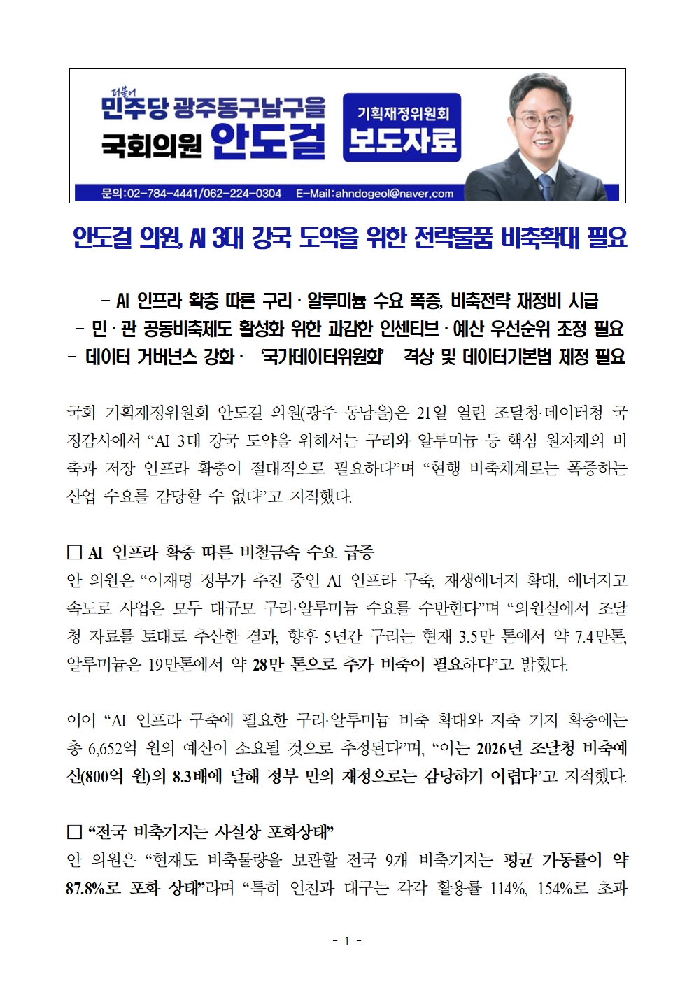 [국회의원 안도걸 보도자료] AI 3대 강국 도약을 위한 전략물품 비축확대 필요