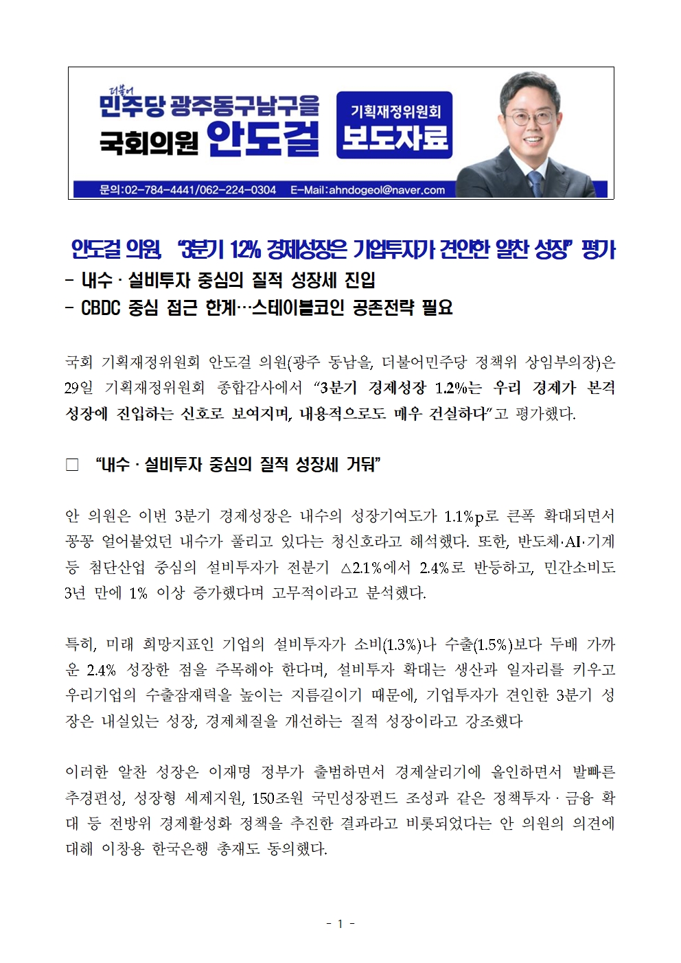 [국회의원 안도걸 보도자료] 3분기 1.2% 경제성장은 기업투자가 견인한 알찬 성장.hwp
