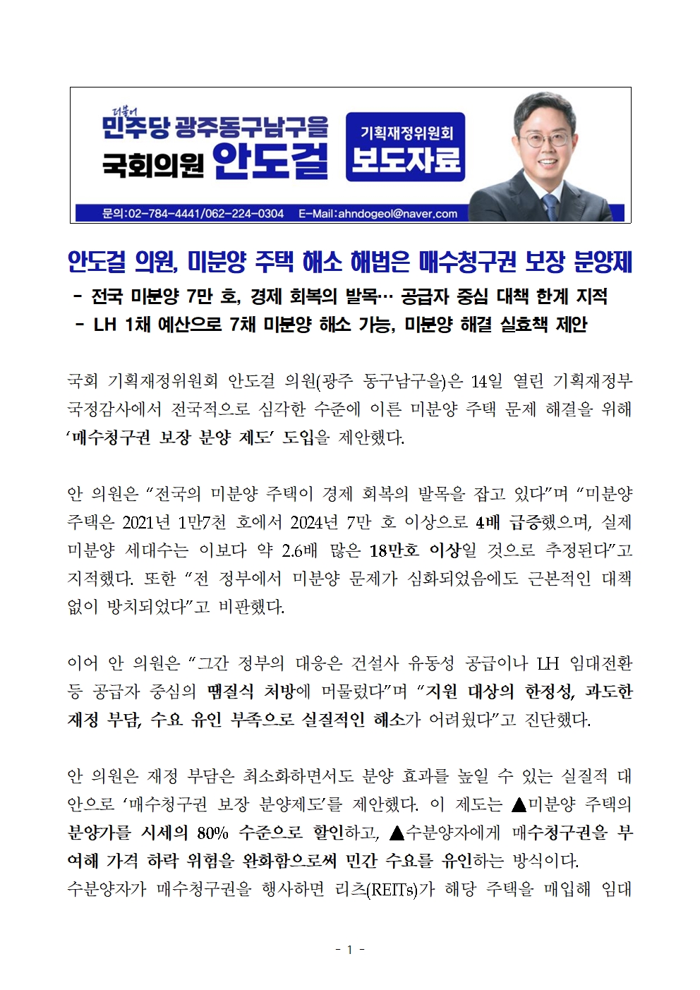 [국회의원 안도걸 보도자료] 미분양 주택 해소 해법은 매수청구권 보장 분양제.hwp