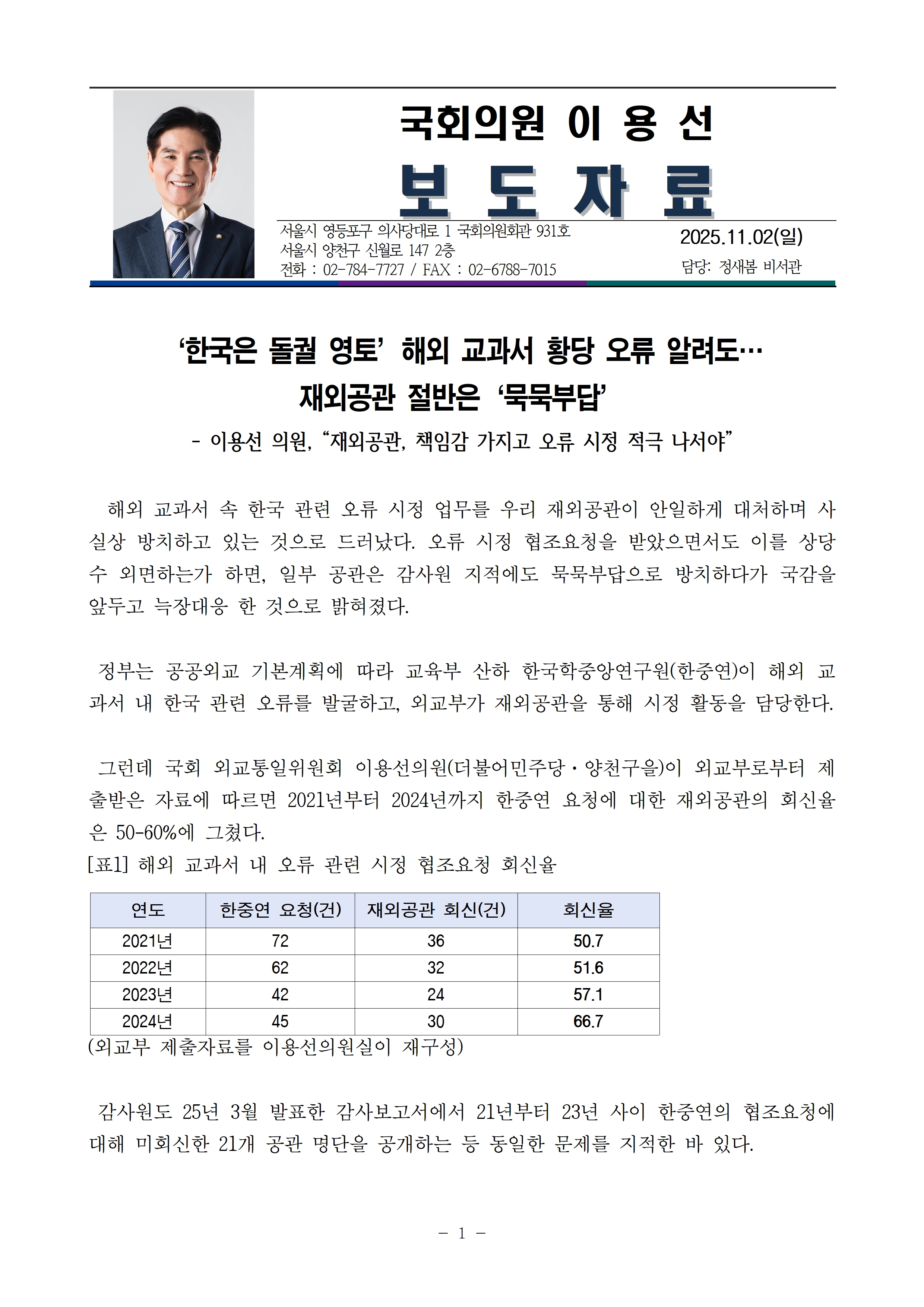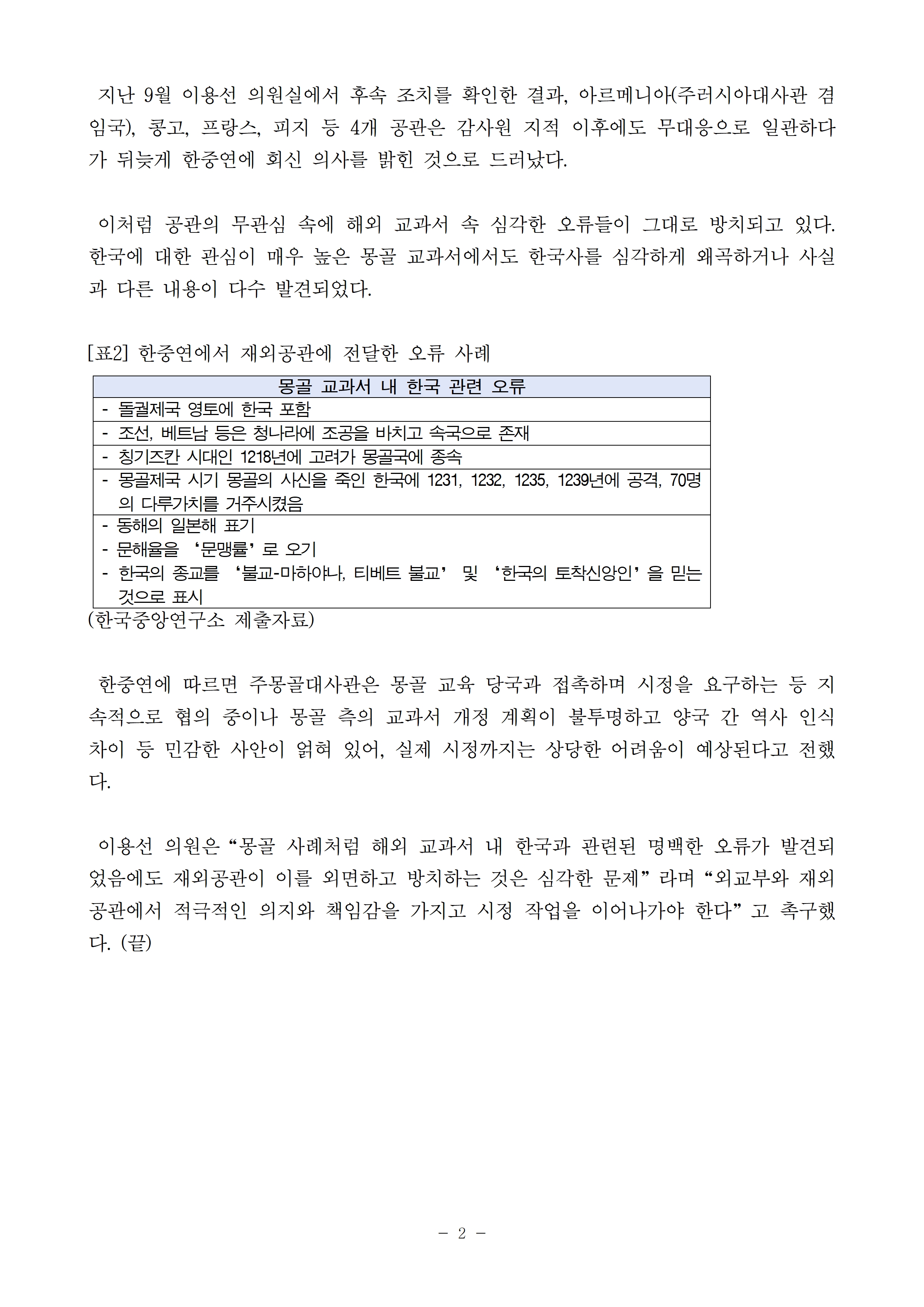 [이용선 국회의원 보도자료] '한국은 돌궐 영토’해외 교과서 황당 오류 알려도… 재외공관 절반은‘묵묵부답’