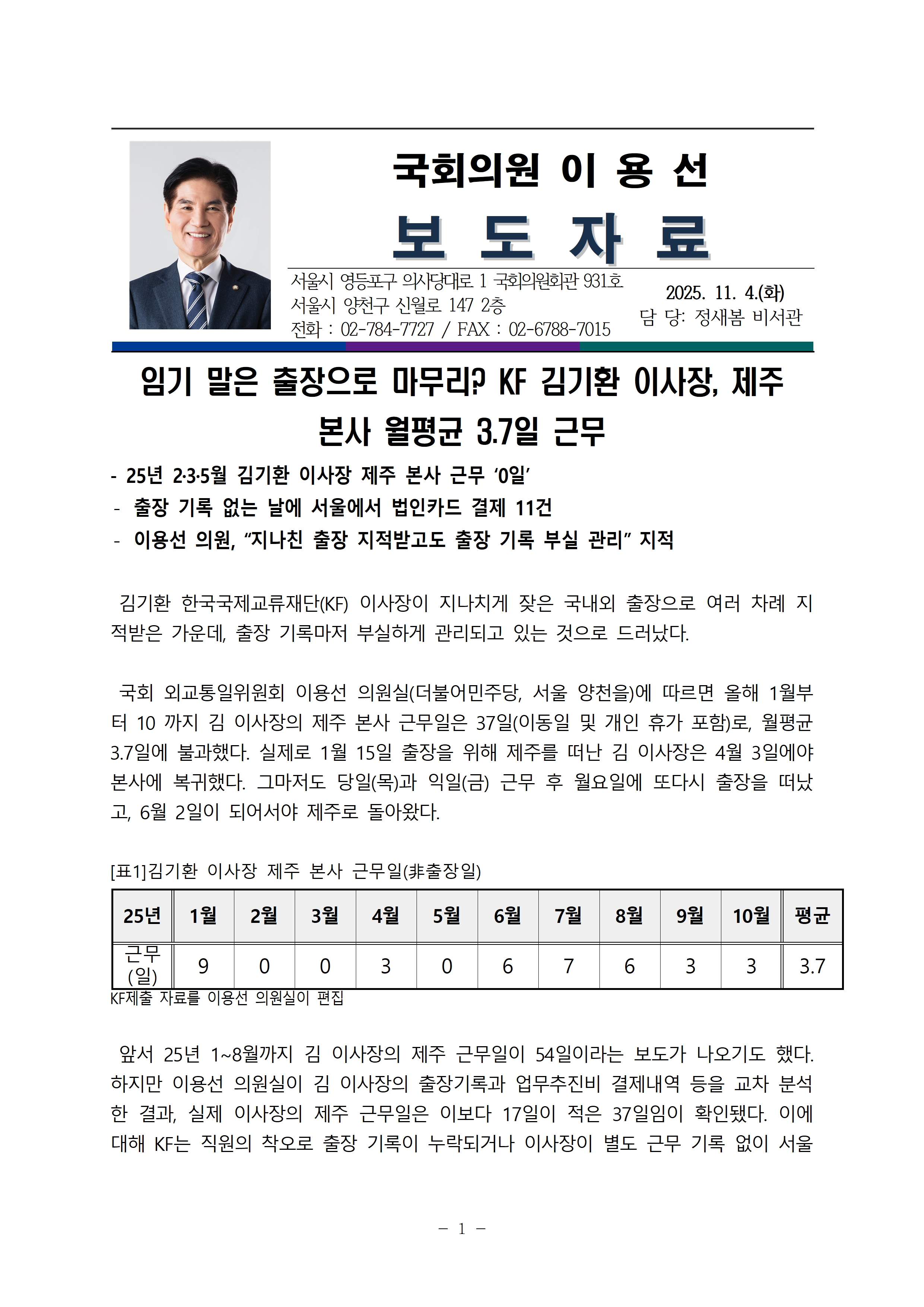 [이용선 국회의원 보도자료] 임기 말은 출장으로 마무리? KF 김기환 이사장, 제주 본사 월평균 3.7일 근무