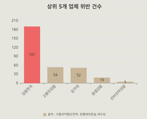 - 국내 대표 김밥 프랜차이즈 김밥천국’, 5년간 식품위생법 191건 위반으로 최다