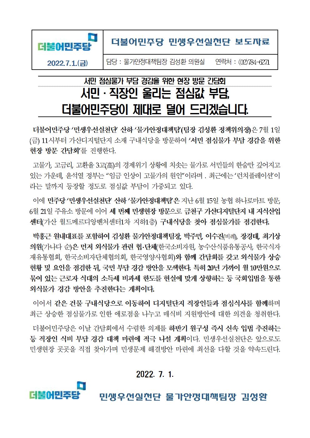[보도자료] 더불어민주당 민생우선실천단 물가안정대책팀 서민 점심물가 부담 경감 현장 방문 간담회_밥값 지원법으로 확실히 지원하겠습니다