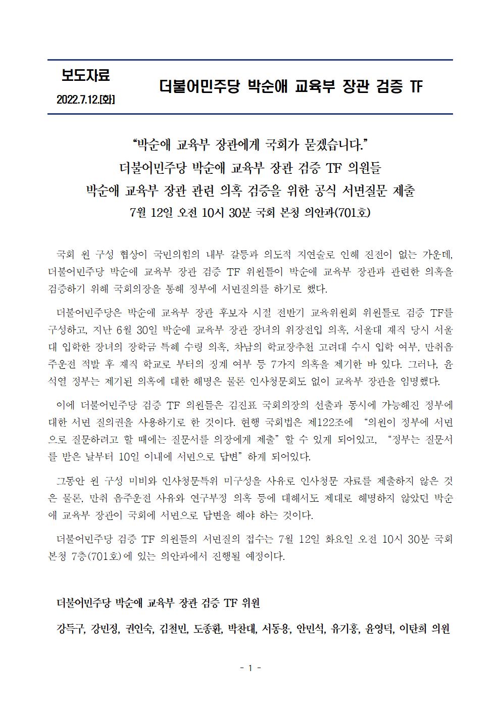 [보도자료] 더불어민주당 박순애 교육부 장관 검증 TF, 박순애 교육부 장관 관련 의혹 검증을 위한 공식 서면질문 제출