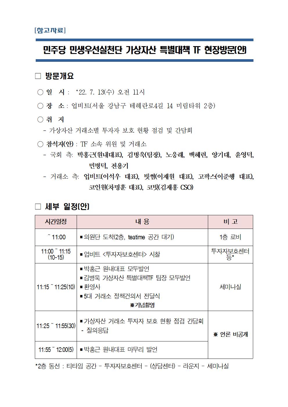 [보도자료] 민주당 민생우선실천단 가상자산 특별대책 TF, 13일 업비트 투자자보호센터 방문