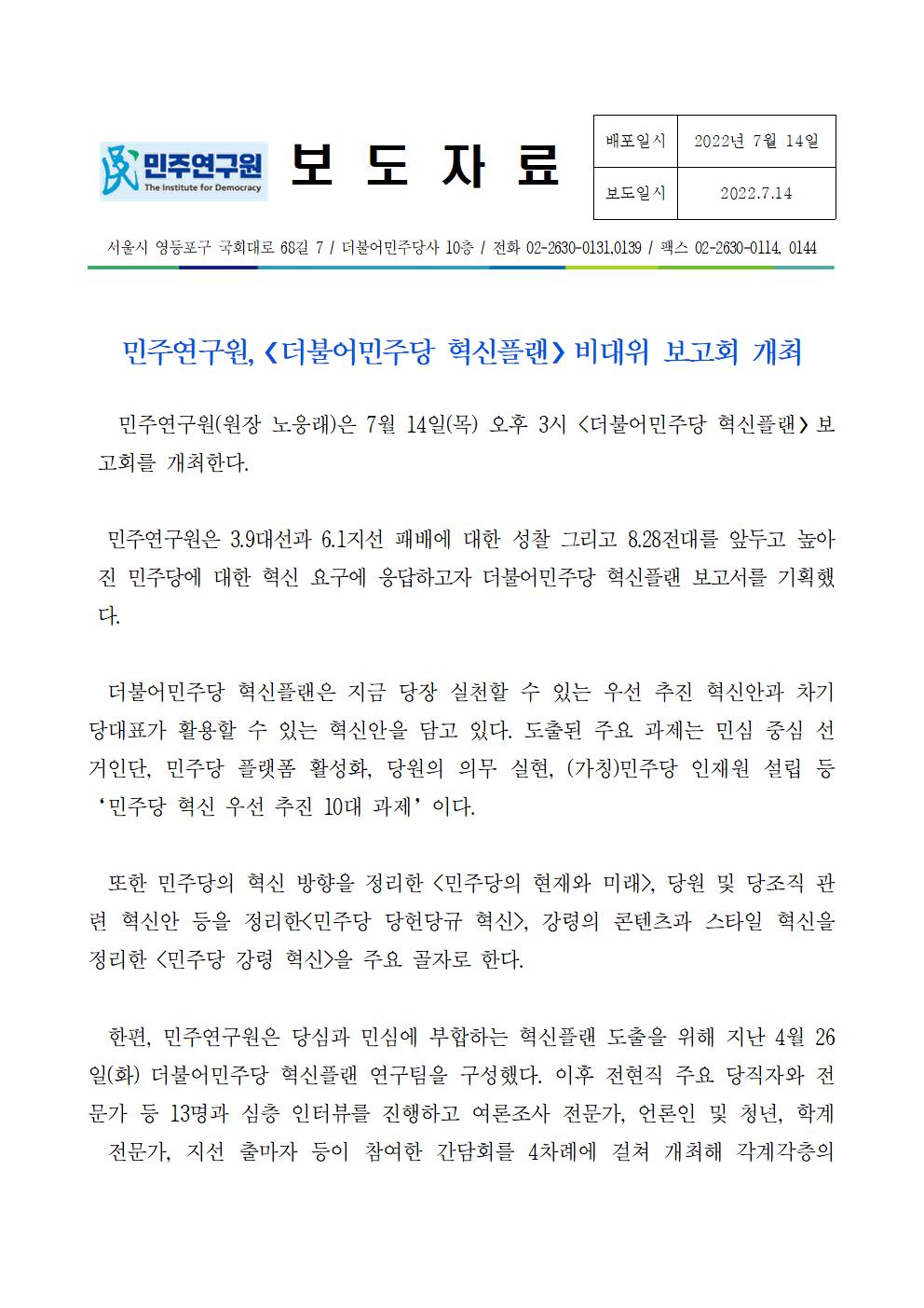 [보도자료] 더불어민주당 민주연구원, '더불어민주당 혁신플랜' 비대위 보고회 개최