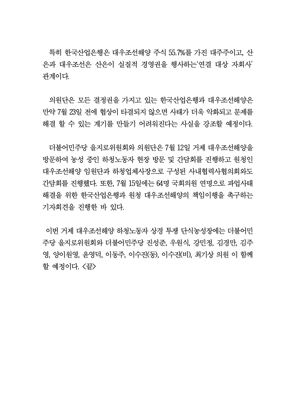[보도자료]을지로위원회 거제 대우조선해양 하청노동자 단식농성장 방문
