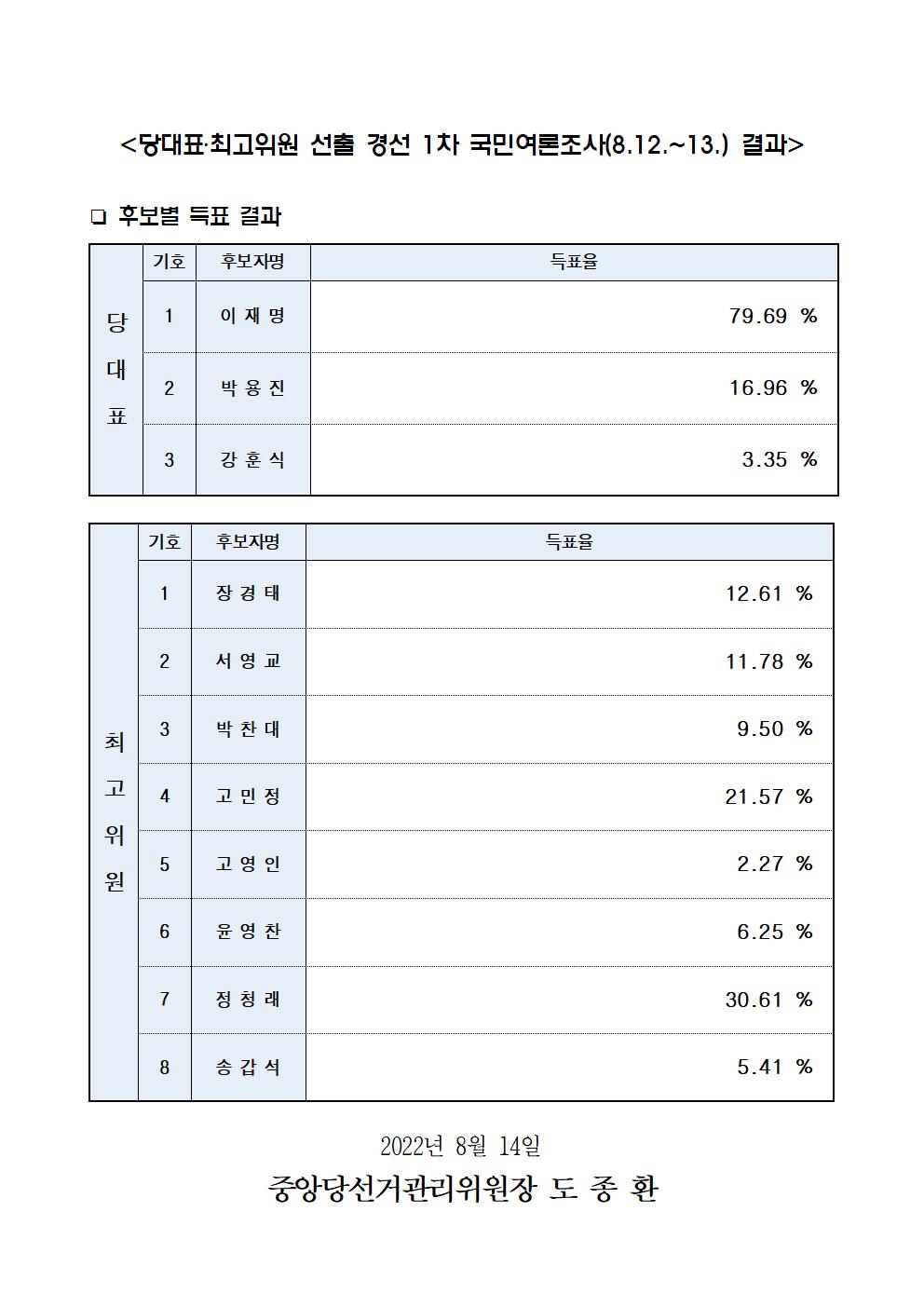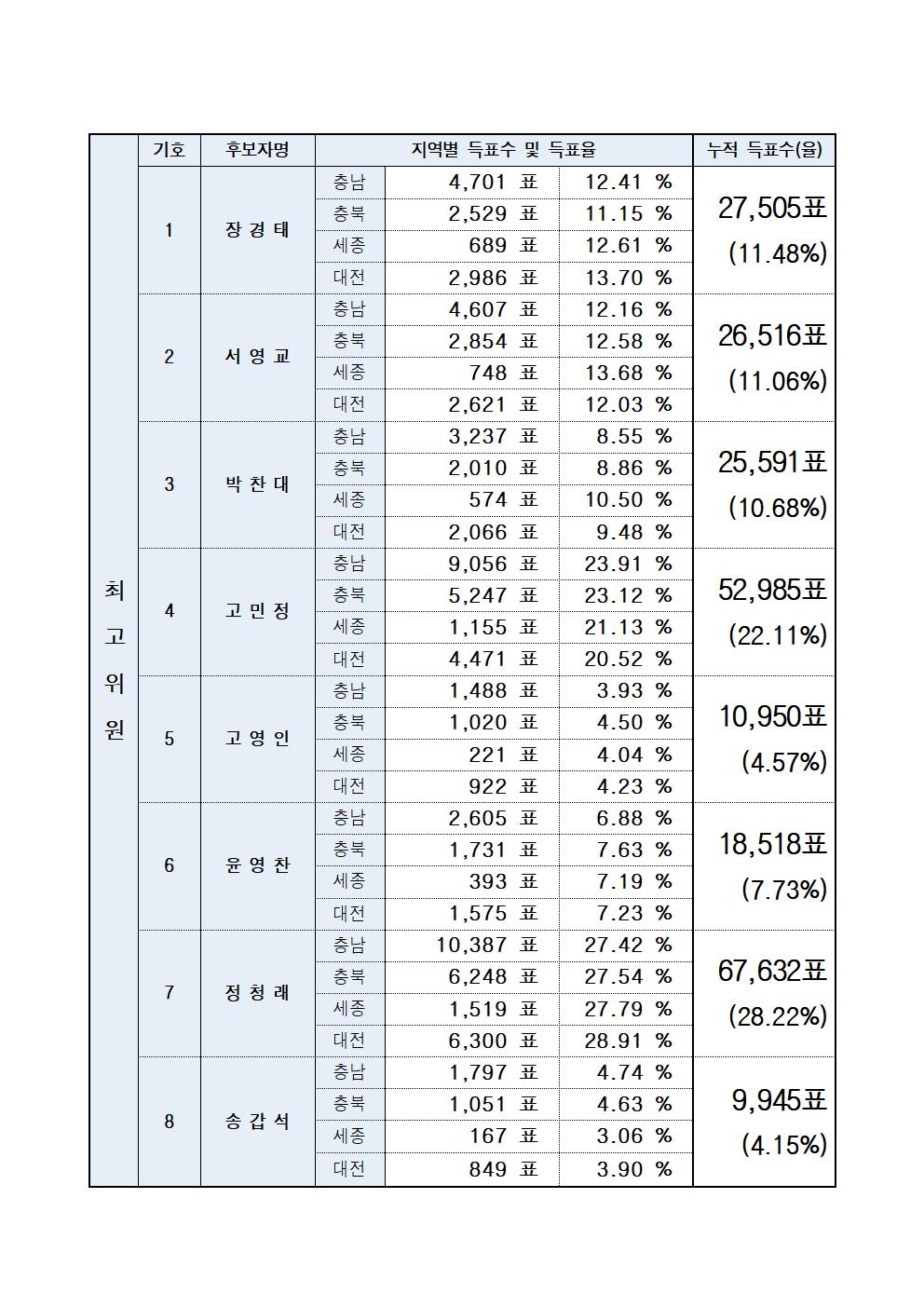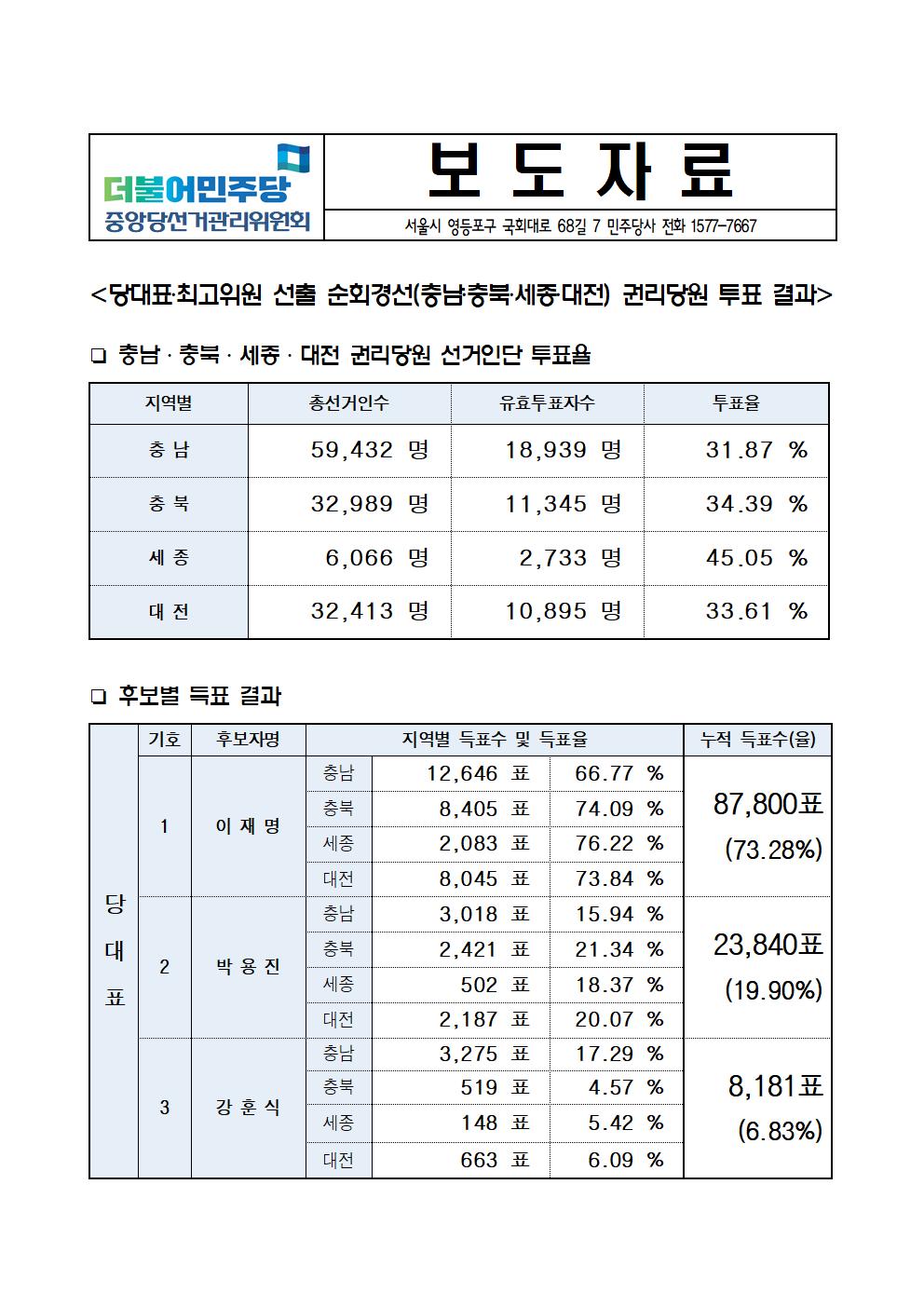 [보도자료] 당대표‧최고위원 선출 순회경선(충남‧충북‧세종‧대전) 권리당원 투표 결과