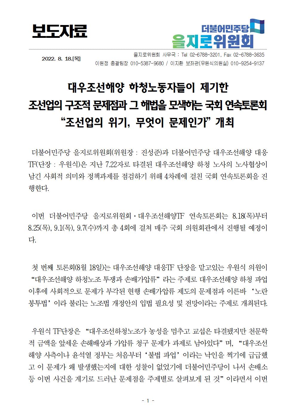 [보도자료] 더불어민주당 을지로위원회, 대우조선해양 하청노동자들이 제기한 조선업의 구조적 문제점과 그 해법을 모색하는 국회 연속토론회 “조선업의 위기, 무엇이 문제인가” 개최