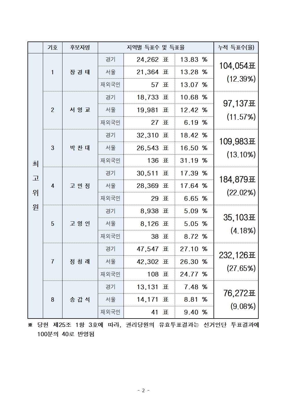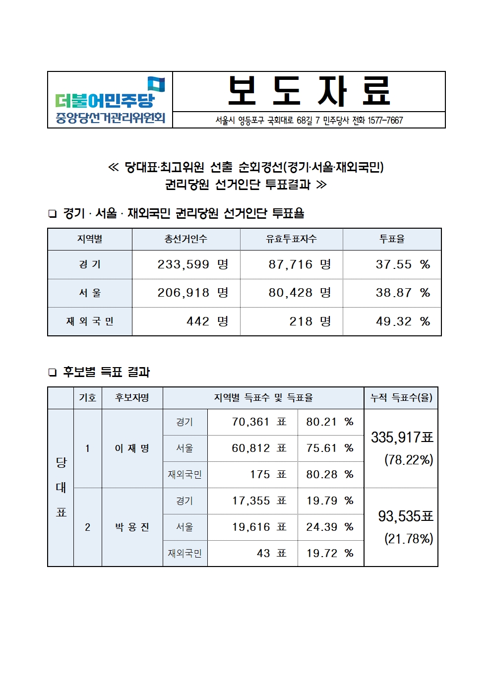 [보도자료] 당대표-최고위원 선출 순회경선(경기, 서울, 재외국민) 권리당원 선거인단 투표결과