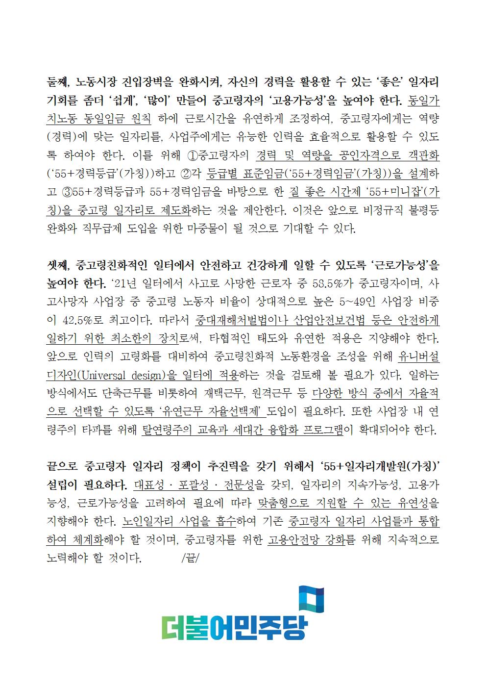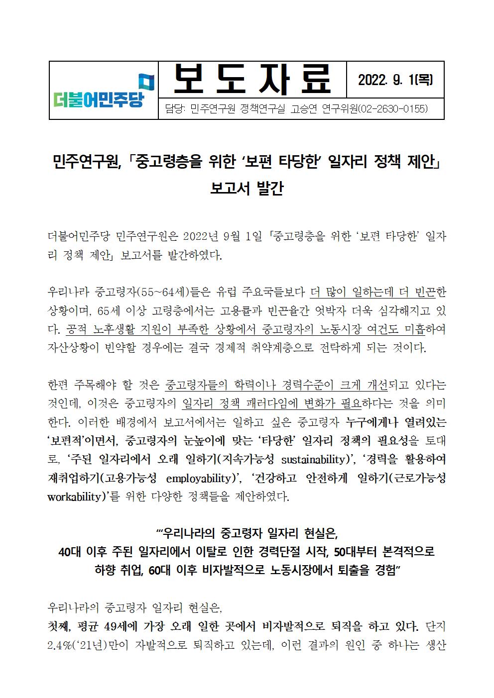 [보도자료] 더불어민주당 민주연구원, 「중고령층을 위한 ‘보편 타당한’ 일자리 정책 제안」 보고서 발간