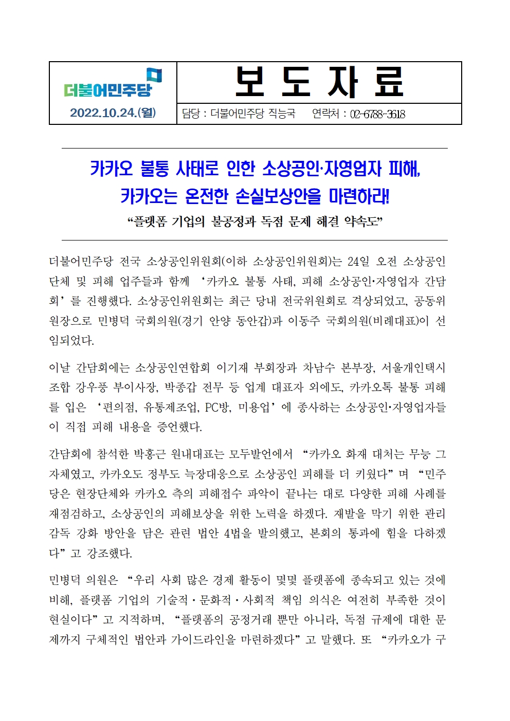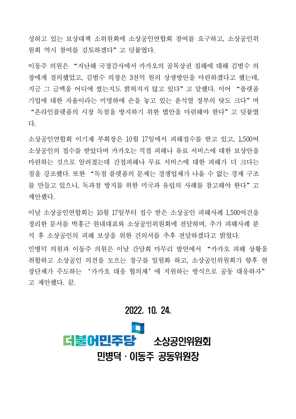 221024_보도자료더불어민주당_소상공인위원회,_카카오_불통_피해_간담회_개최_FN(수정).hwp